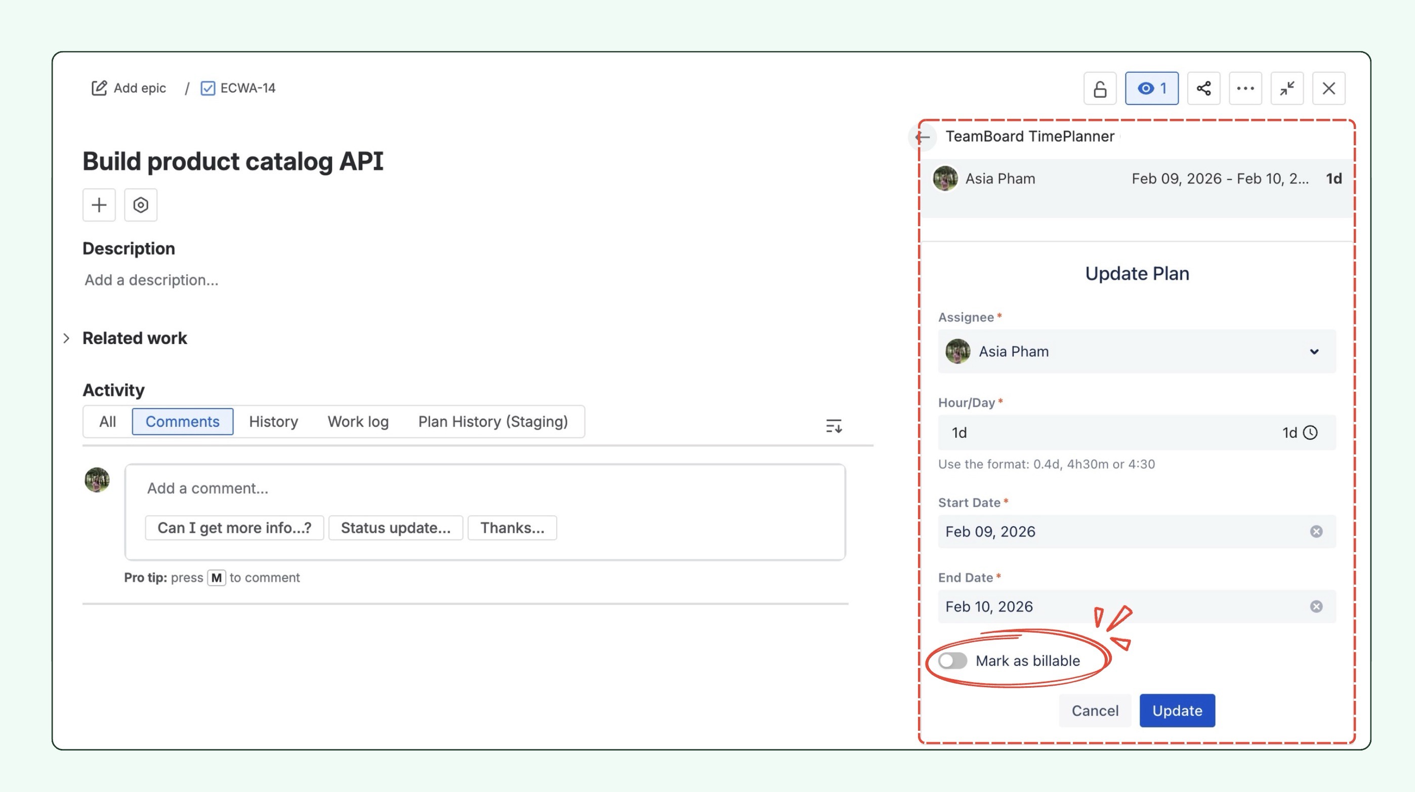 The Mark as Billable feature is now available directly on Jira work items when planning tasks via TeamBoard TimePlanner. You can easily toggle the billable status from the right panel, making it more convenient to manage and track billable hours while planning tasks.