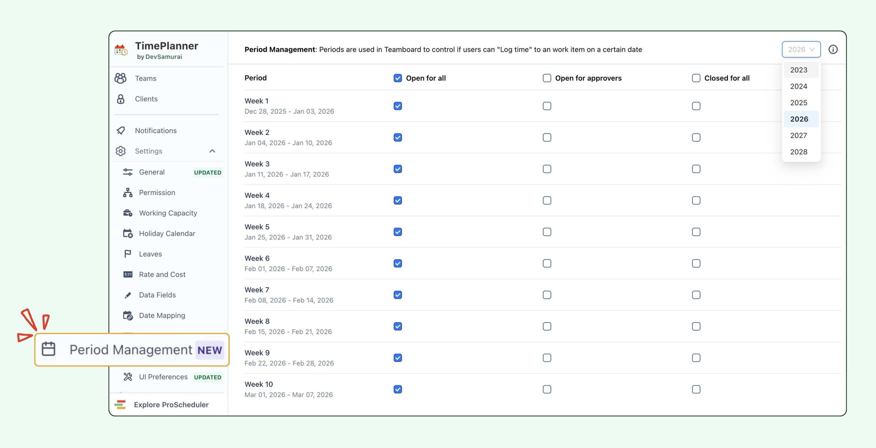 TimePlanner now includes the Period Management feature, which allows administrators to define specific, often weekly time intervals for employee timesheets. By managing these periods, administrators can lock or unlock them, which prevents users from adding, editing, or deleting time logs after a designated period closes, ensuring data integrity for payroll and reporting.