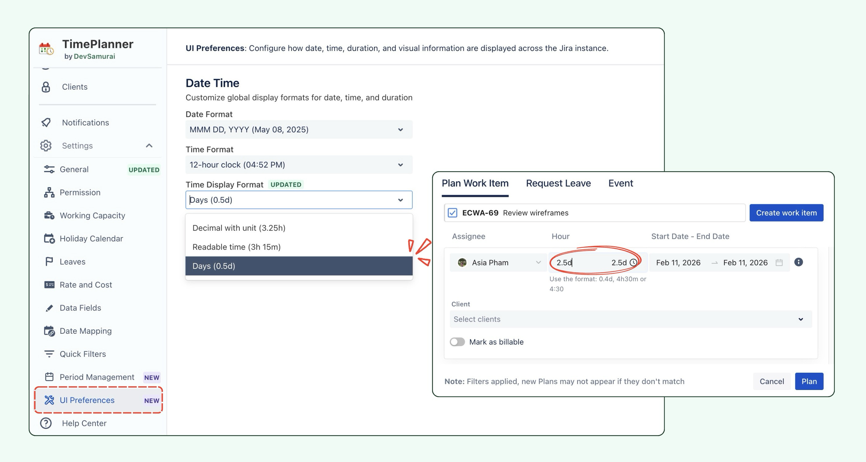 TimePlanner now allows users to configure the Time Display Format to show time in days (e.g., 0.5d, 3d), offering a more flexible and user-friendly way to view and track time spent on tasks. This setting will impact how time is displayed when planning tasks on the Schedule Board.