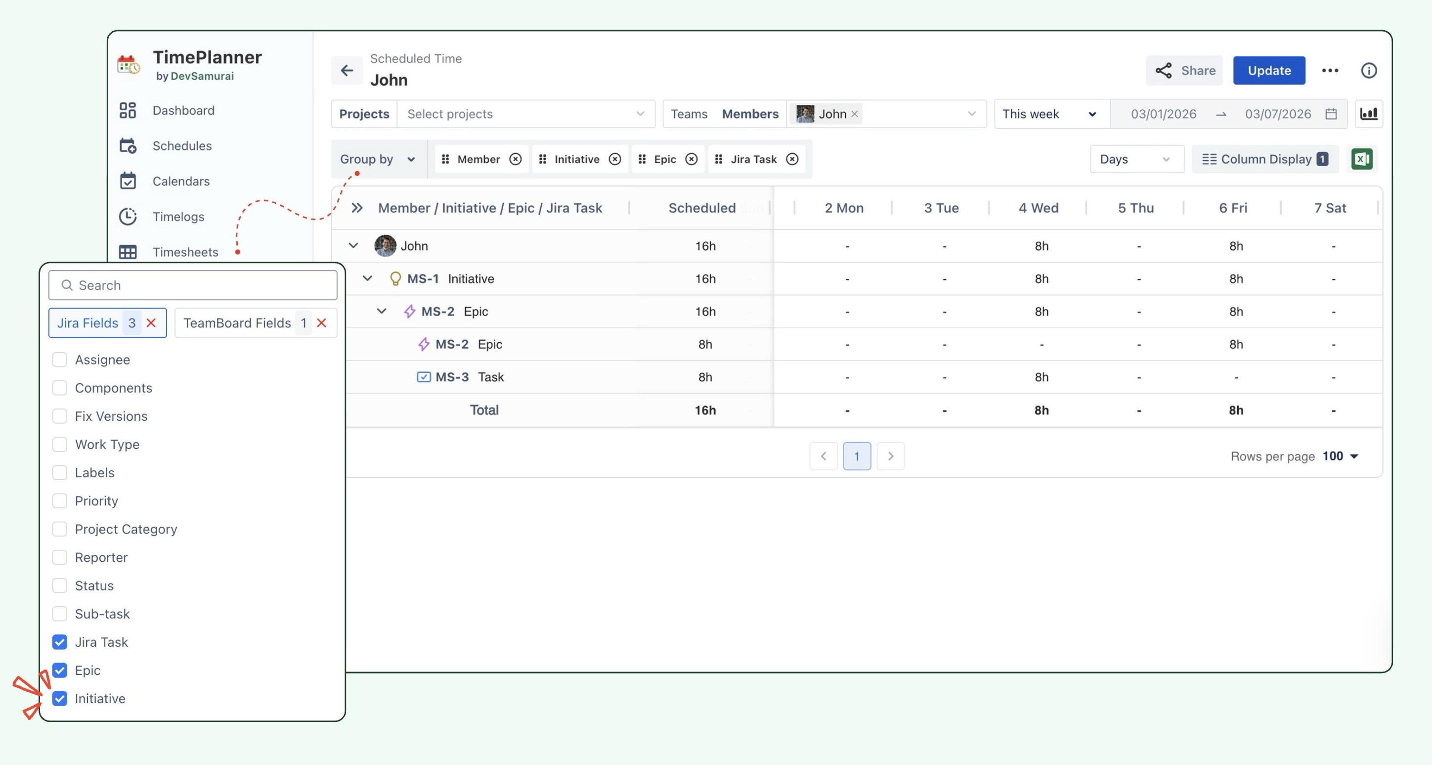 Worklogs and scheduled hours can now be aggregated at the Initiative level in the report. By selecting the "Initiative" field in the "Group by" options, you can view aggregated data for entire initiatives, providing a clearer overview of progress and helping with more effective project tracking.
