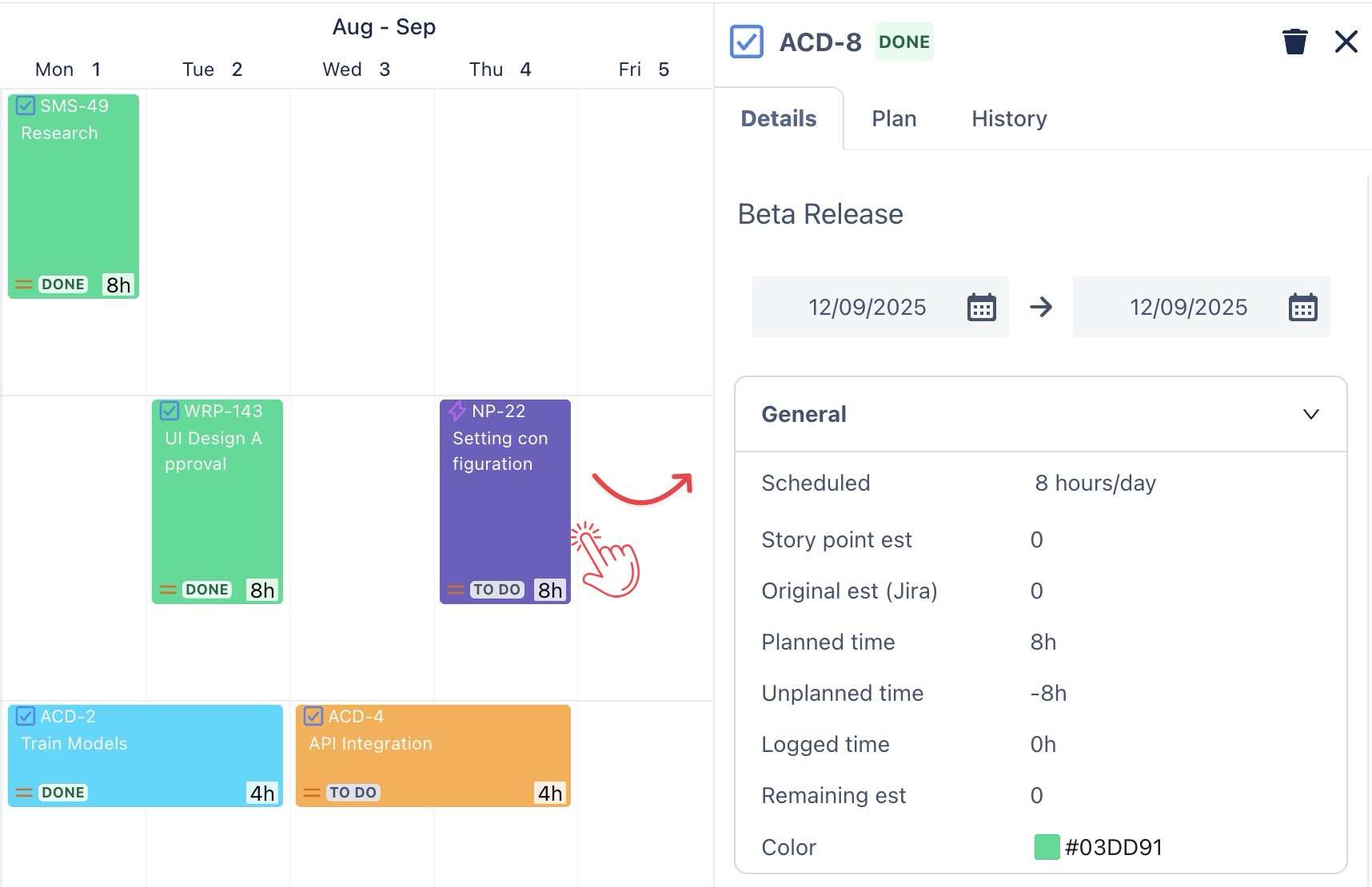 Simply click directly on the task card to open the Planning Detail panel.