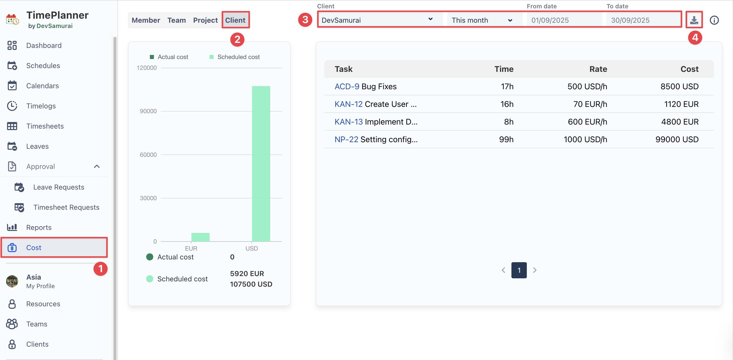 Billing Admin can generate detailed Client Cost Reports to track costs, monitor project spending, and analyze financials across tasks and projects. Reports can cover any date range, giving you a flexible view of your client-related costs.
