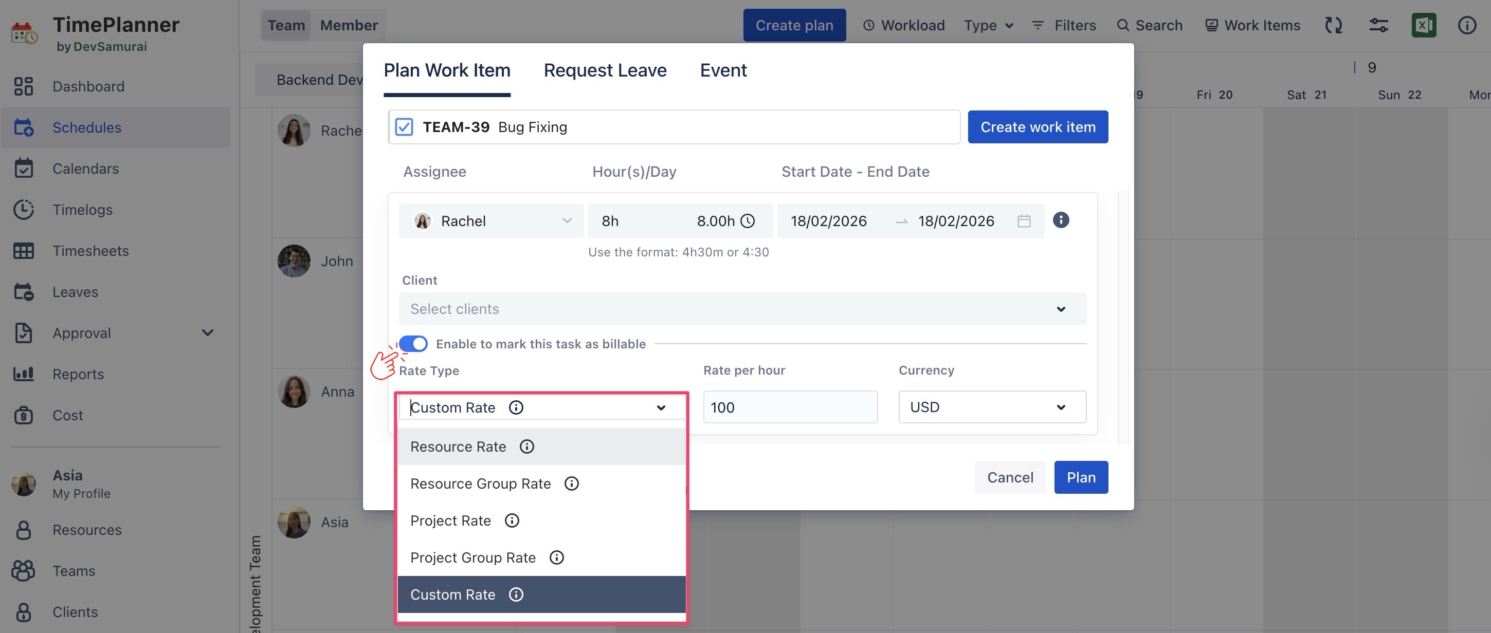 Tracking billable hours is essential for converting planned work into billable tasks that reflect actual costs. In TeamBoard TimePlanner, you can plan, mark, and log billable work to generate precise cost calculations.
