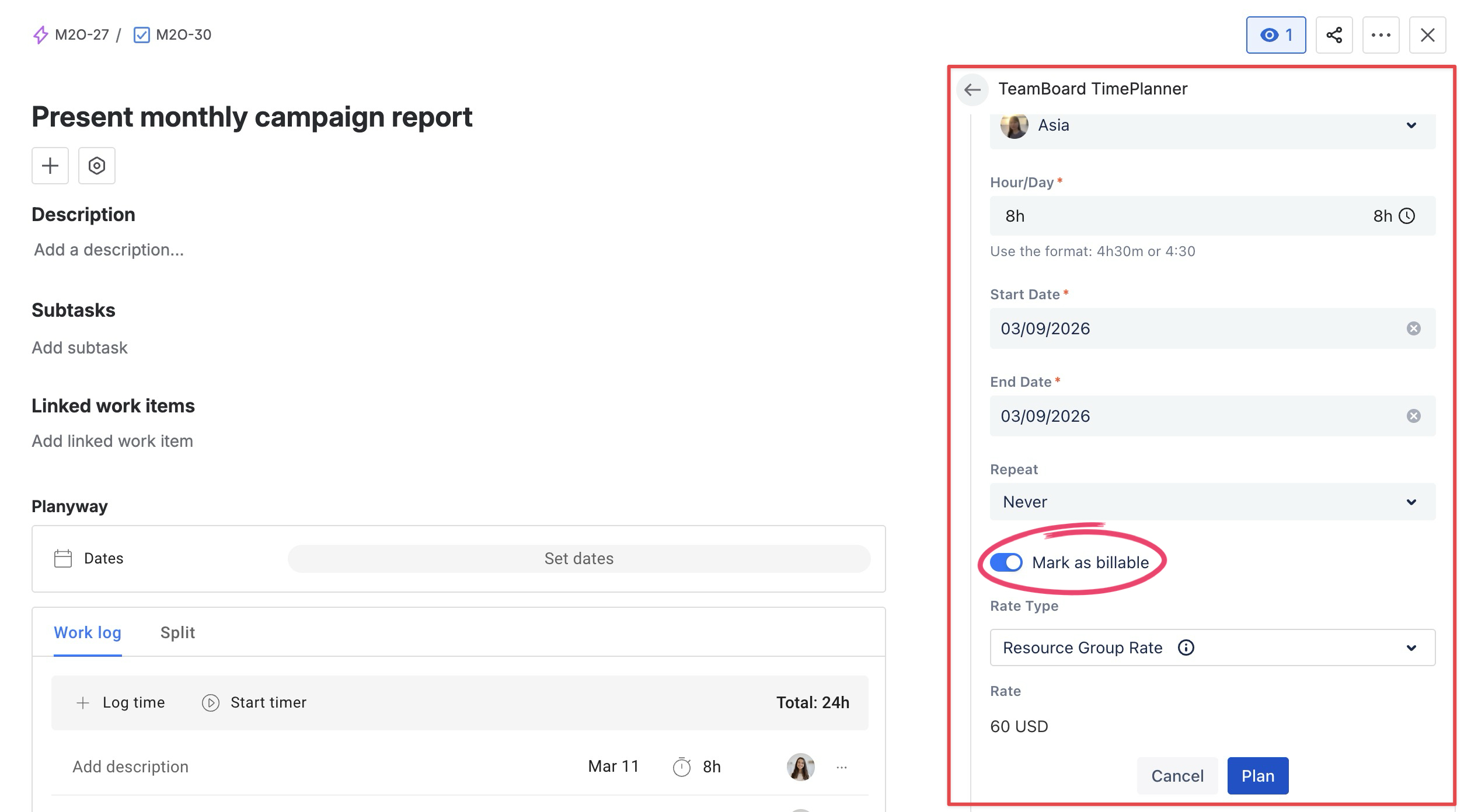 In the TeamBoard TimePlanner planning section > Mark the task as Billable.
