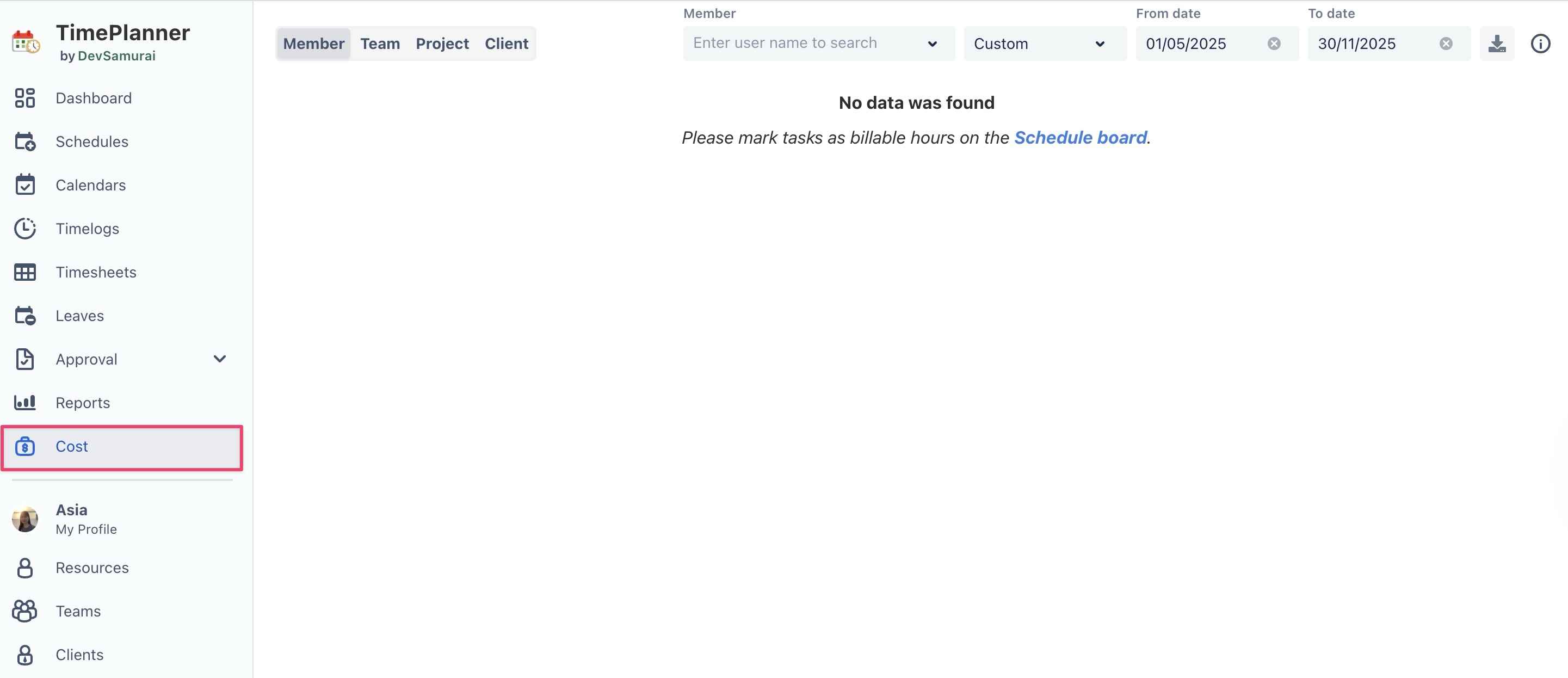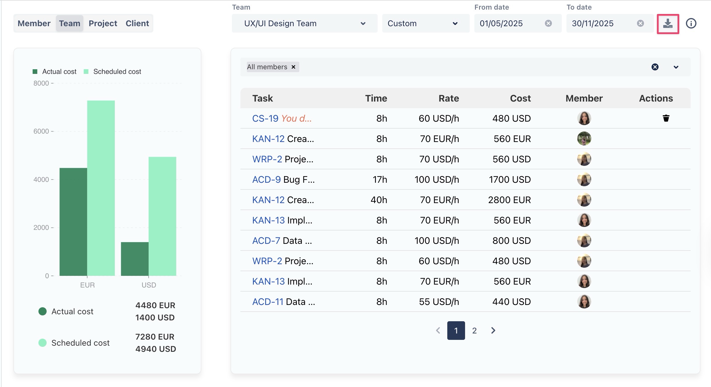 Use the filter to quickly find a specific member, team, project, or client, and customize the date range to narrow the report to the specific period you want to analyze.