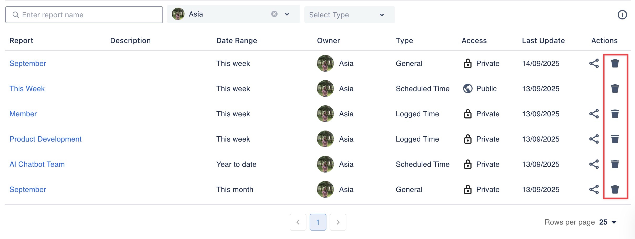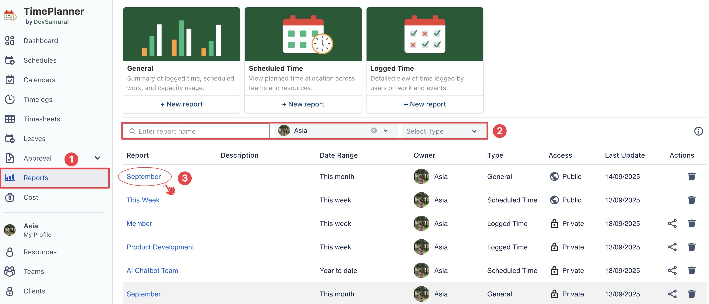 Use the search bar or filters (Owner, Report Type) to locate the report.