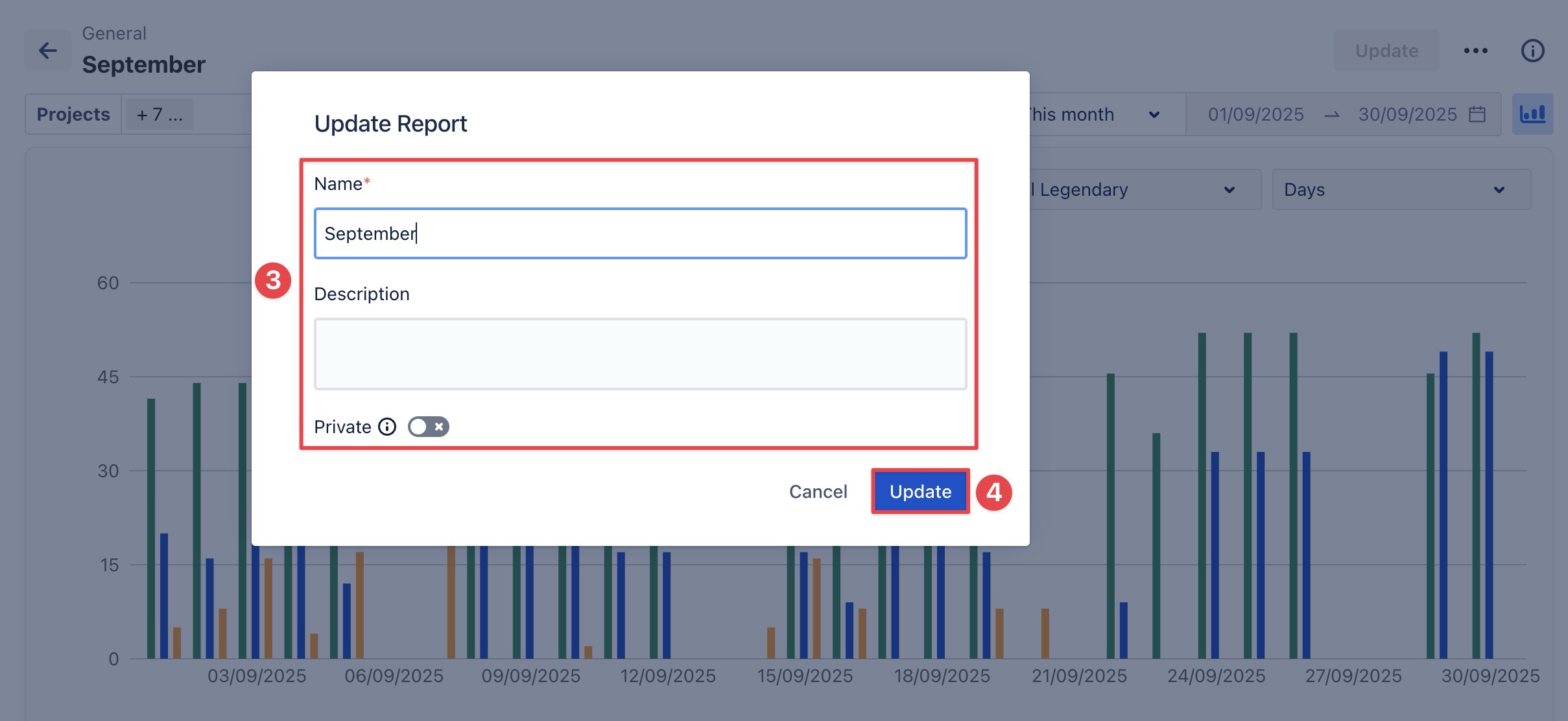 Update the report name and optionally add or edit the description.
