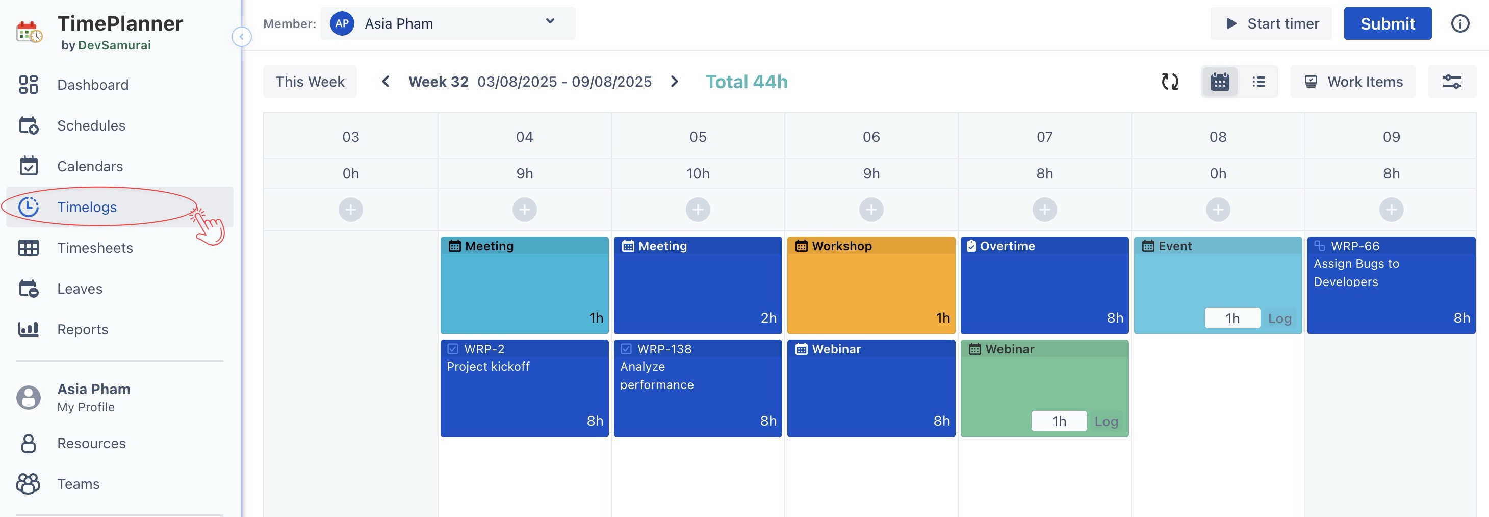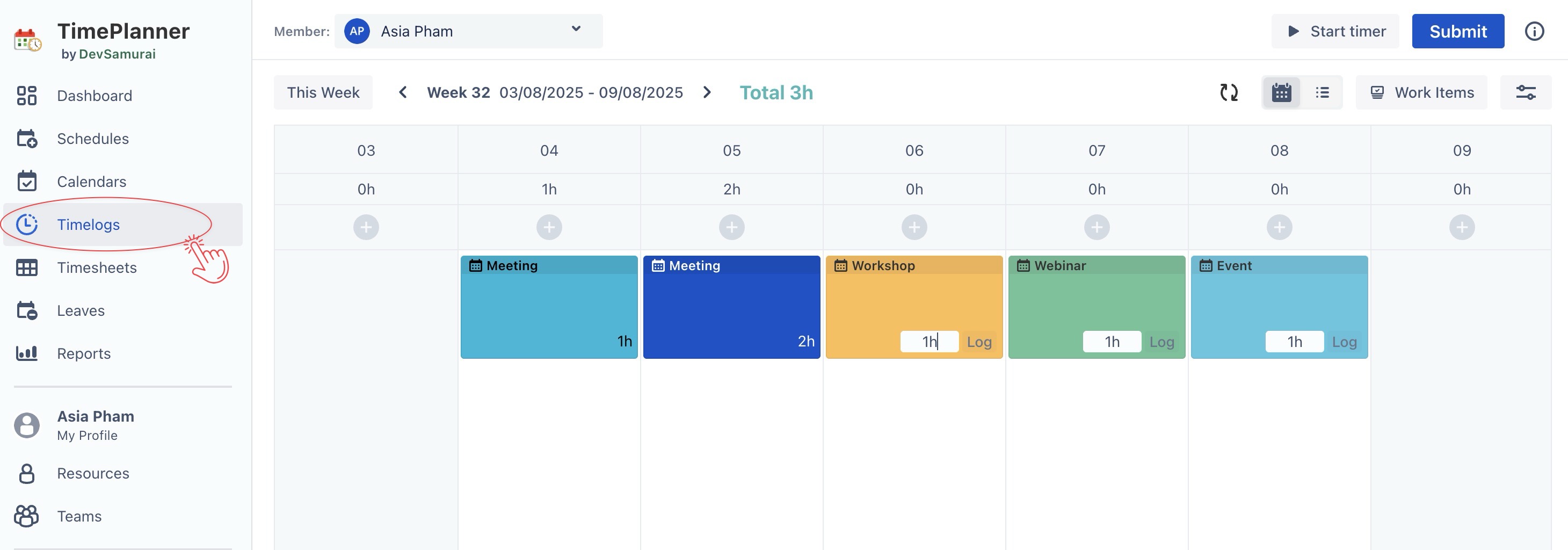 Timelogs section from the left sidebar.