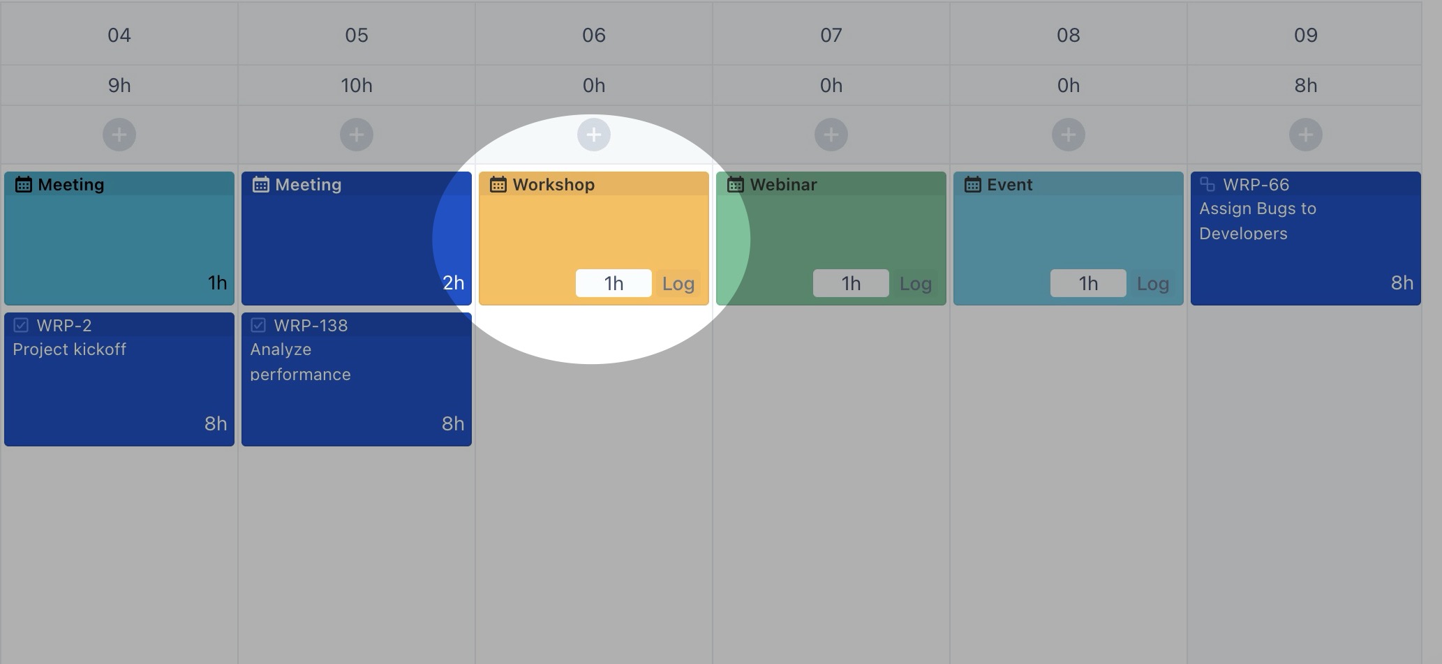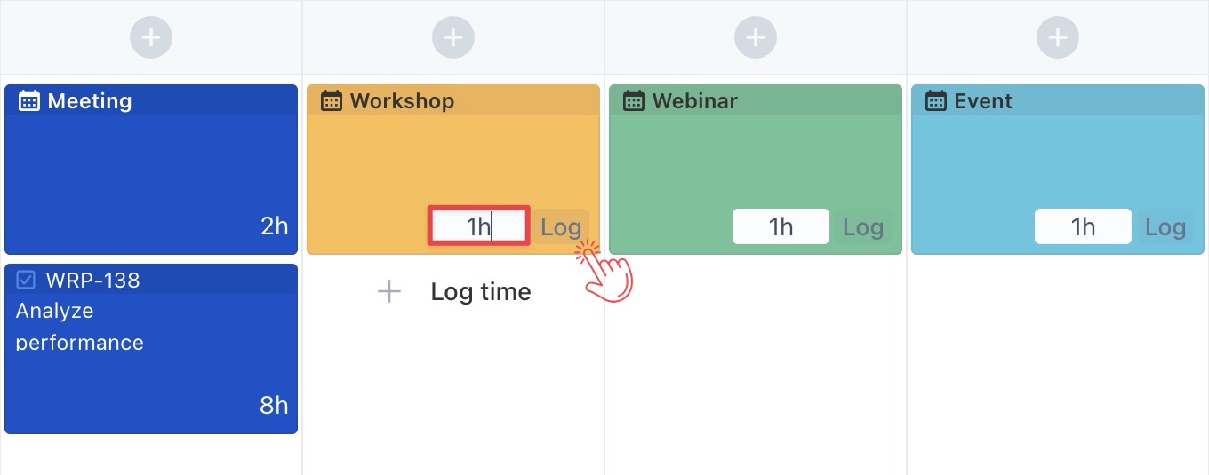 Hover over the empty cell for the event, then click the (+) button to open the Log Time form.