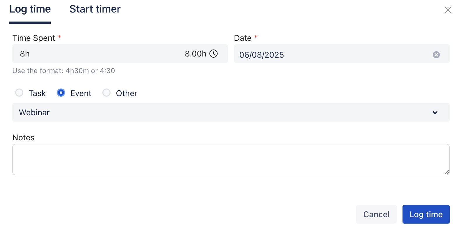 Fill in the details, including time spent, date, and notes.