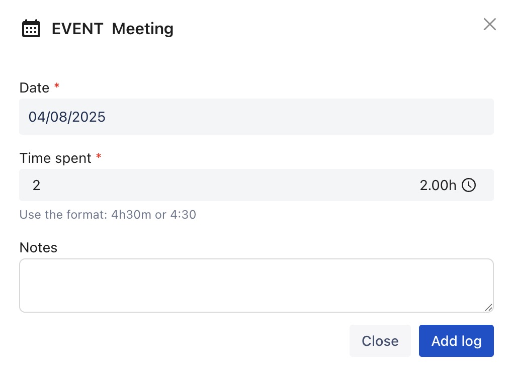 Fill in the event details, including time spent, date, and any relevant notes.