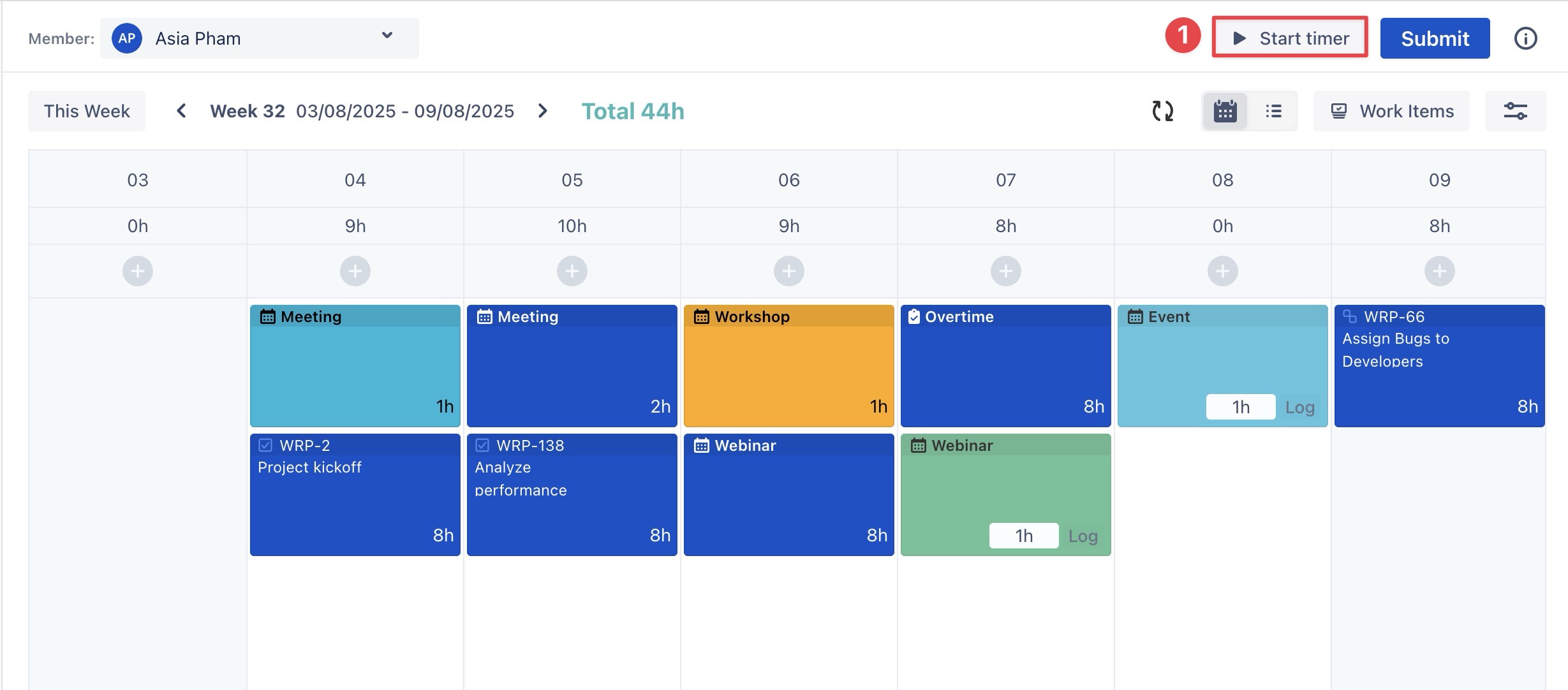 You can log time for events or custom tasks using Calendar View, List View, or the Start Timer feature.