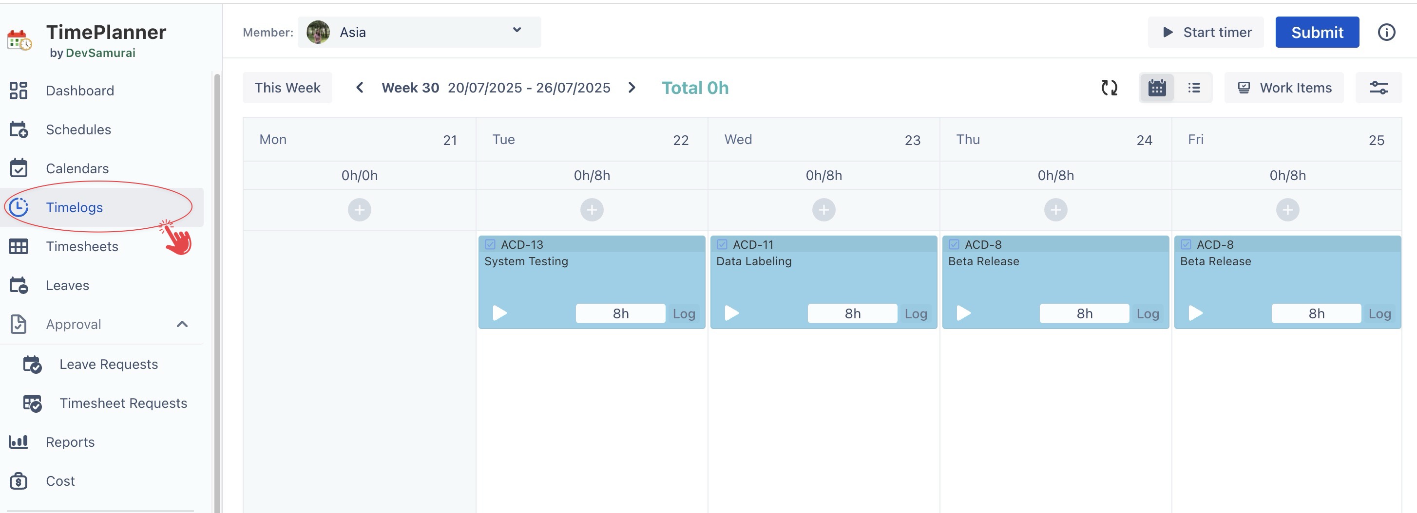 Timelogs section from the left sidebar.