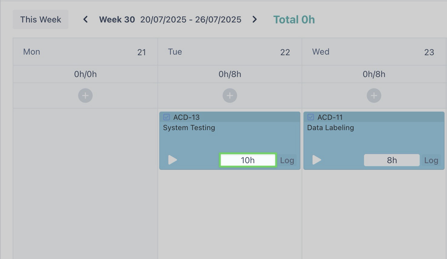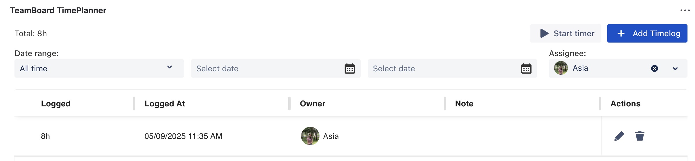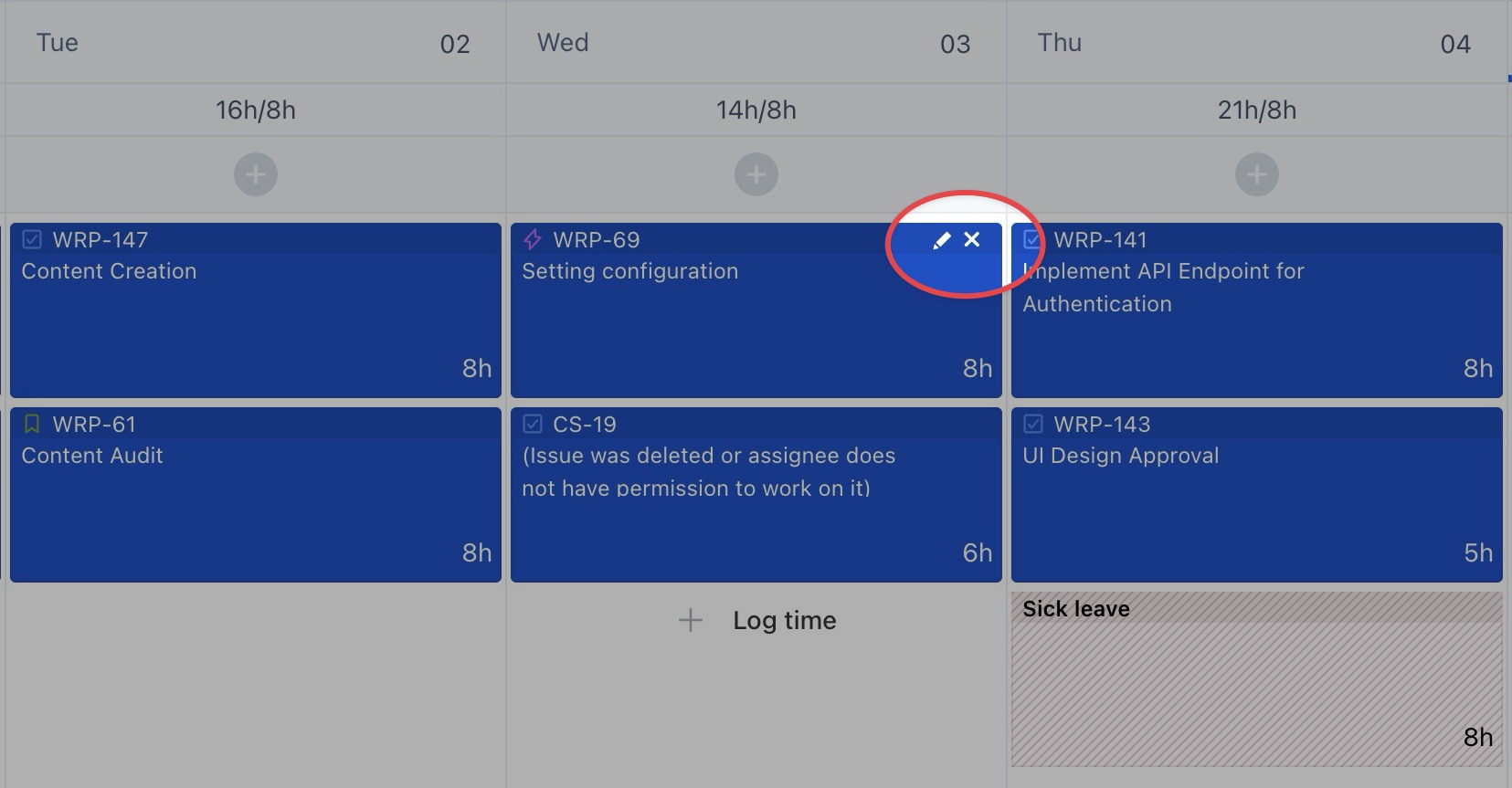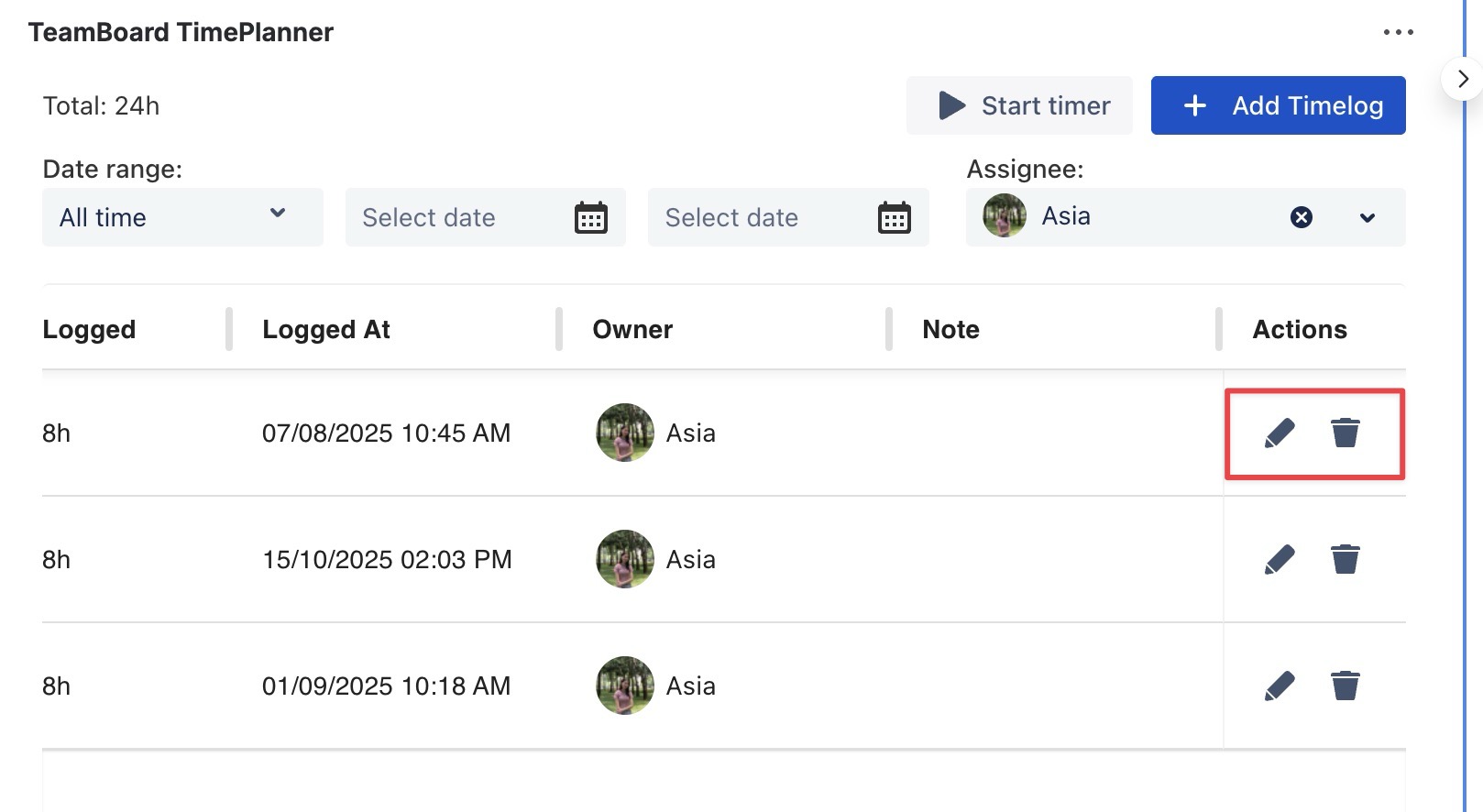 To edit or delete a timelog entry: Hover over the task card associated with the time log.