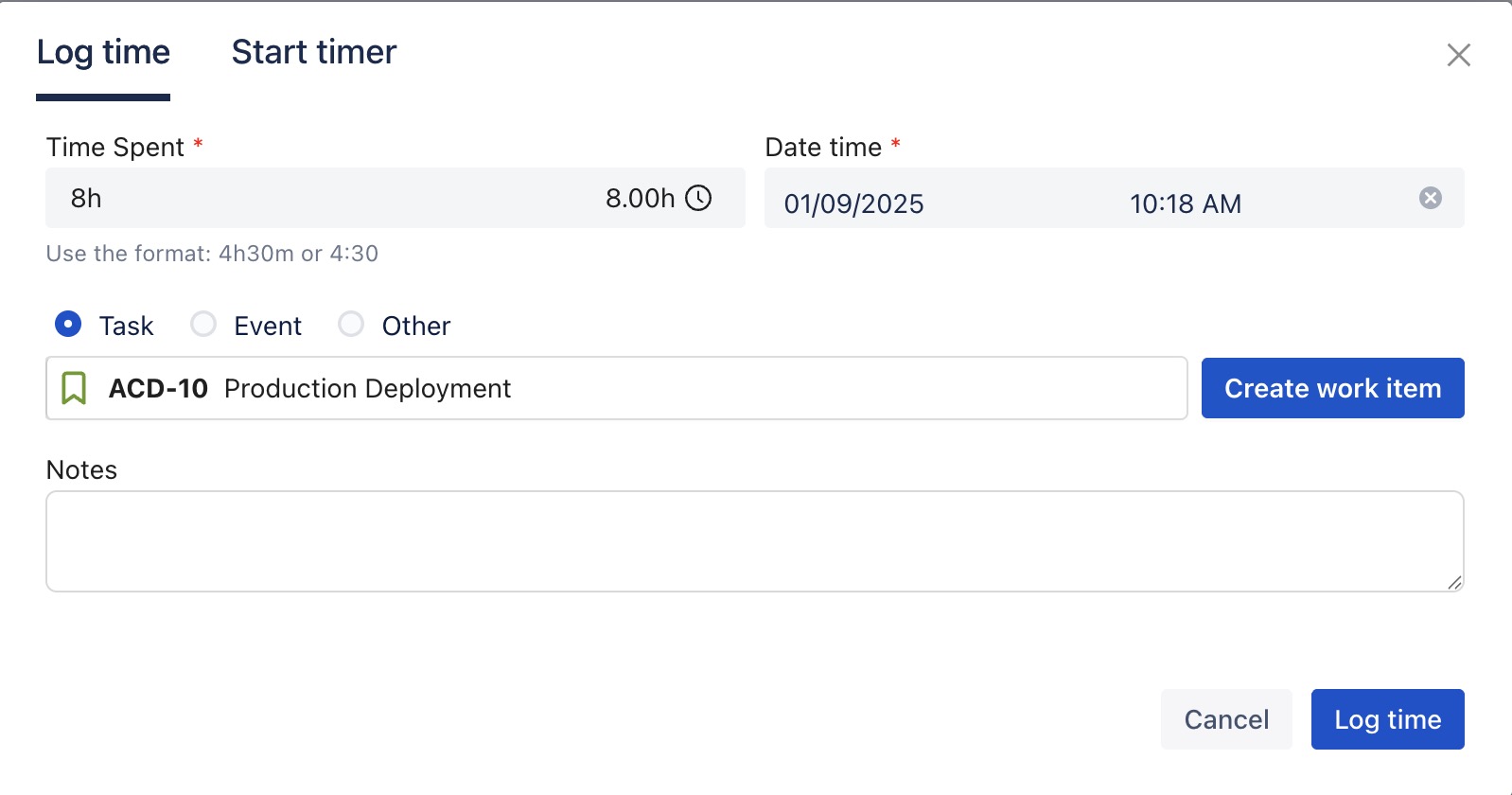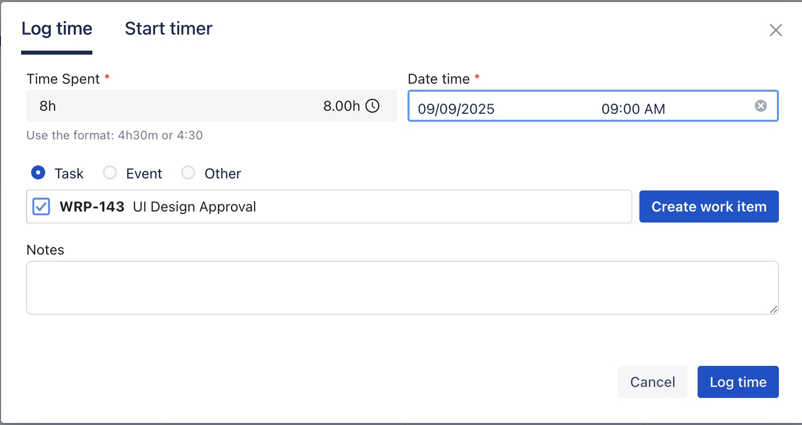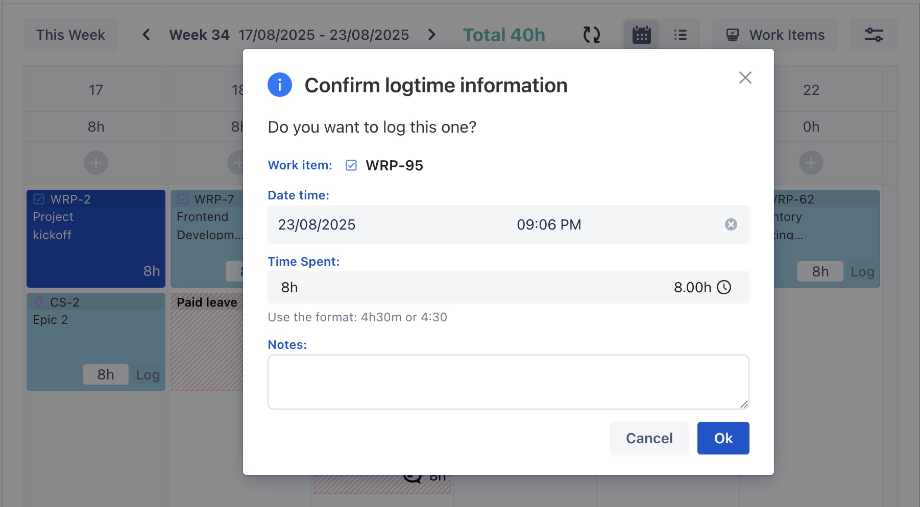 The Log Time form will appear. Fill in the details, then click OK to save the time log entry.