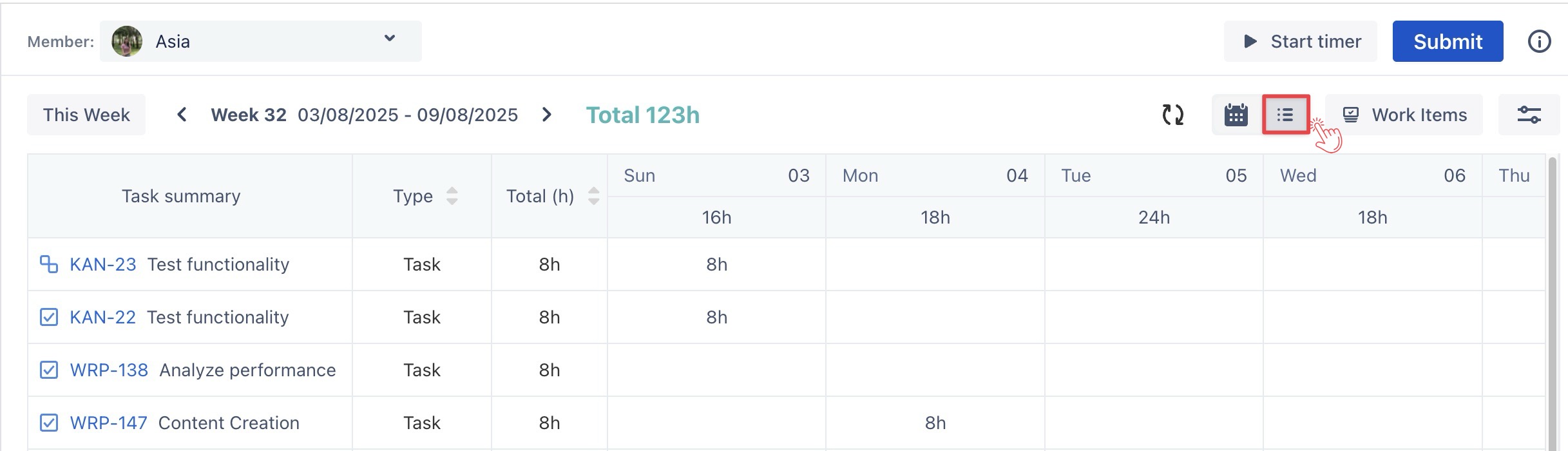 Your Timelogs are the same data in Calendar view, List view, or Jira Work Item Details. You can easily log, edit, and view your time entries in any format, depending on your preference.