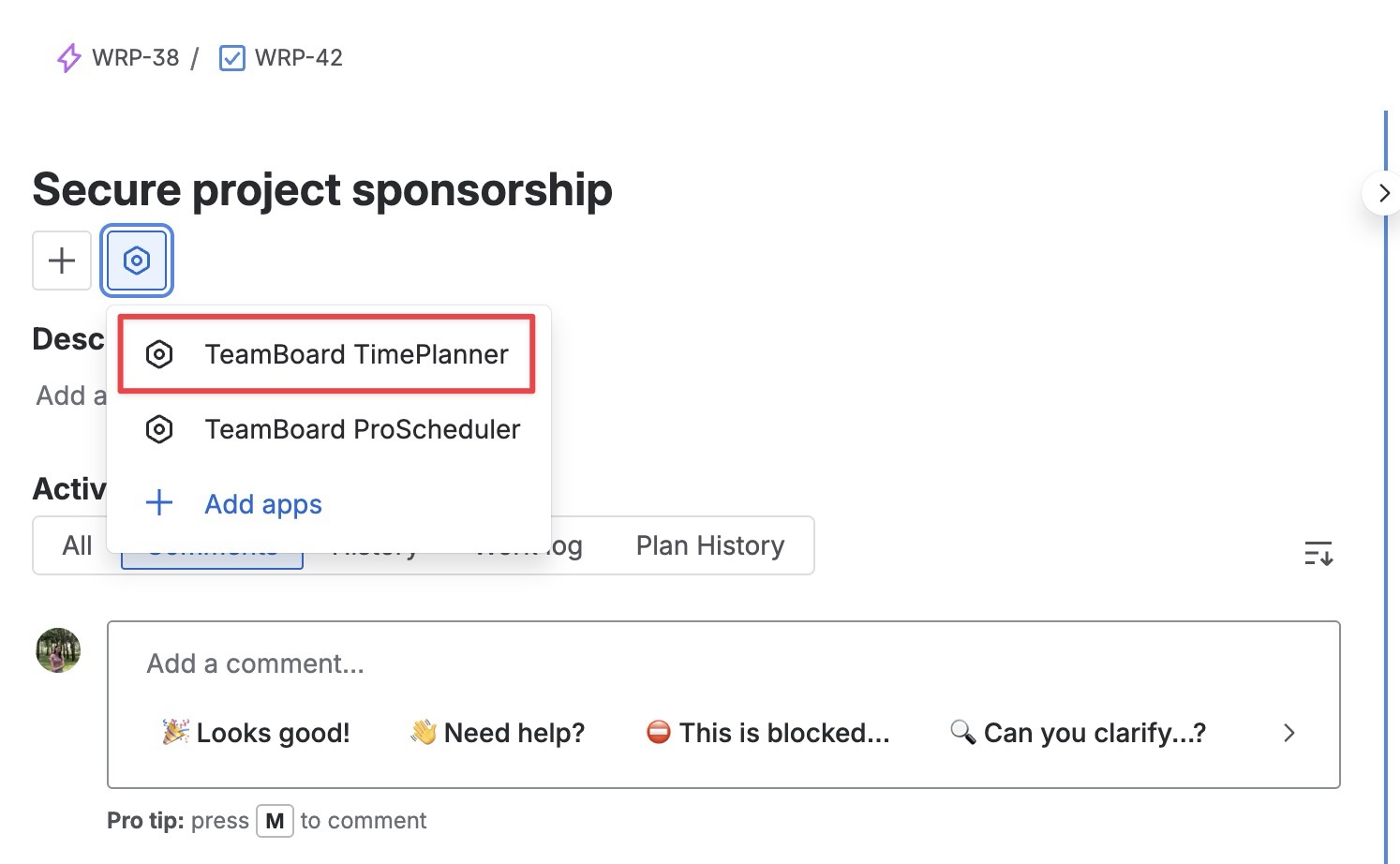 The TimePlanner section will appear within the Jira work item details.