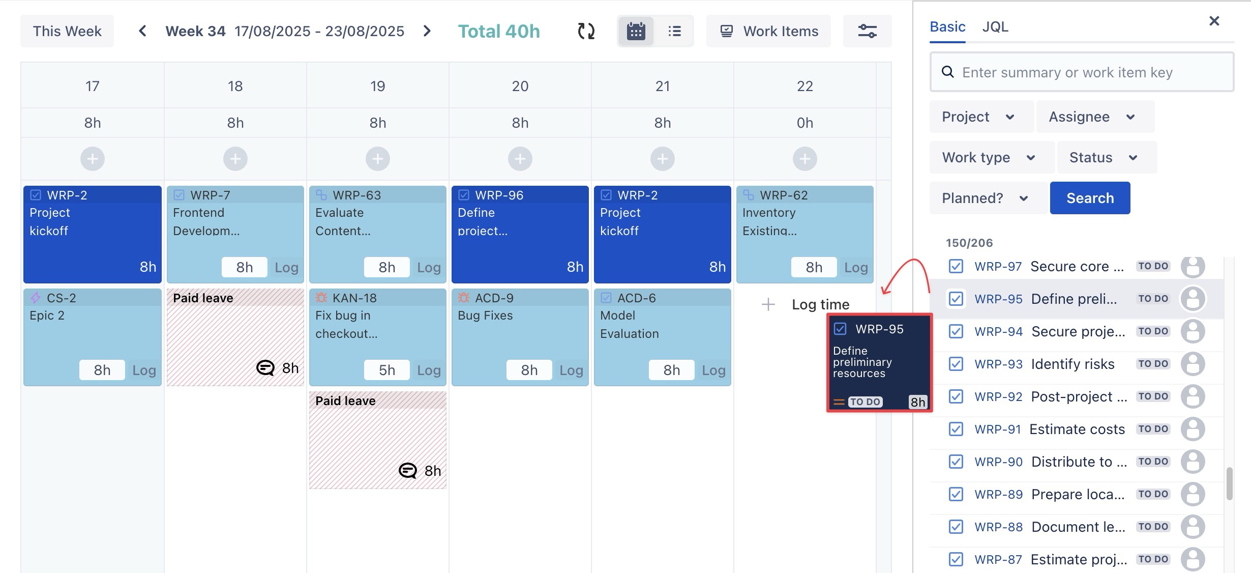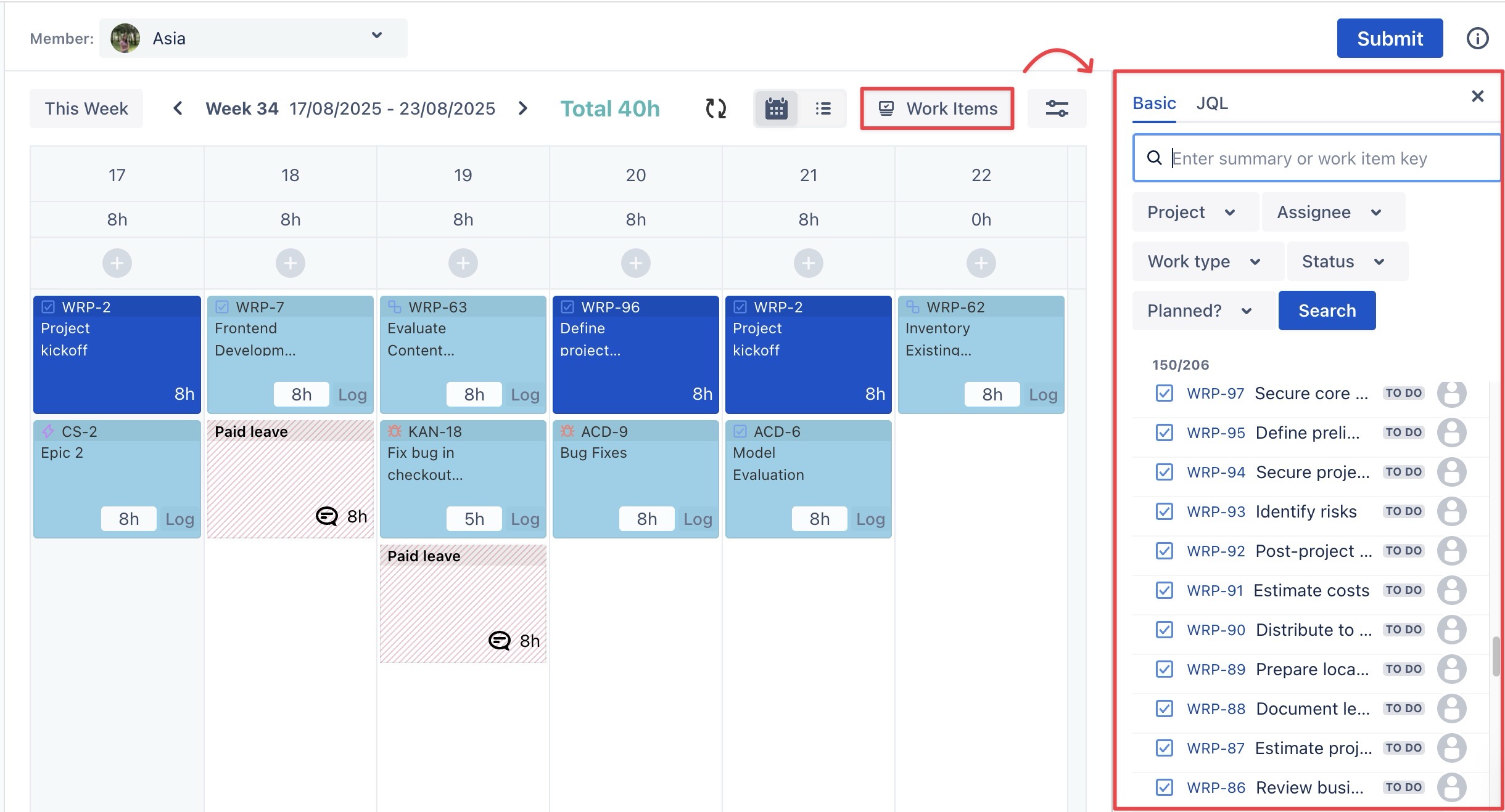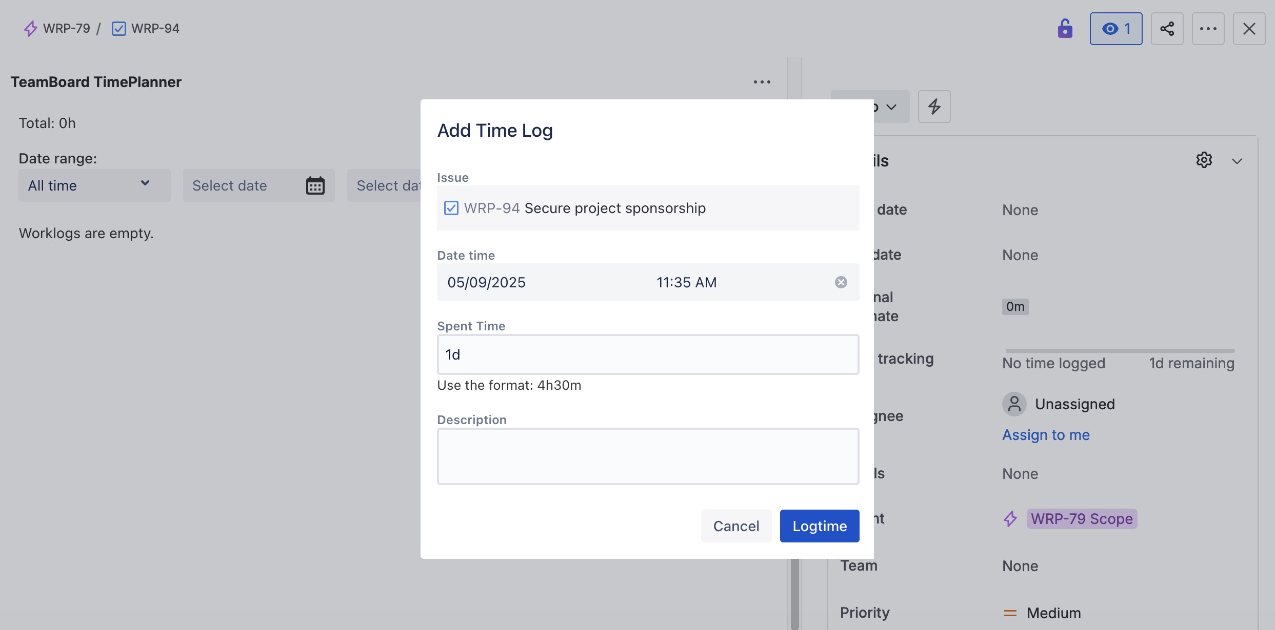 You can log time directly from a Jira Work Item without opening the TimePlanner app. Follow these steps: