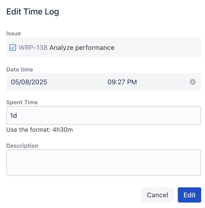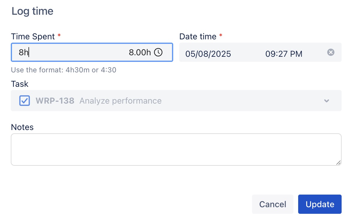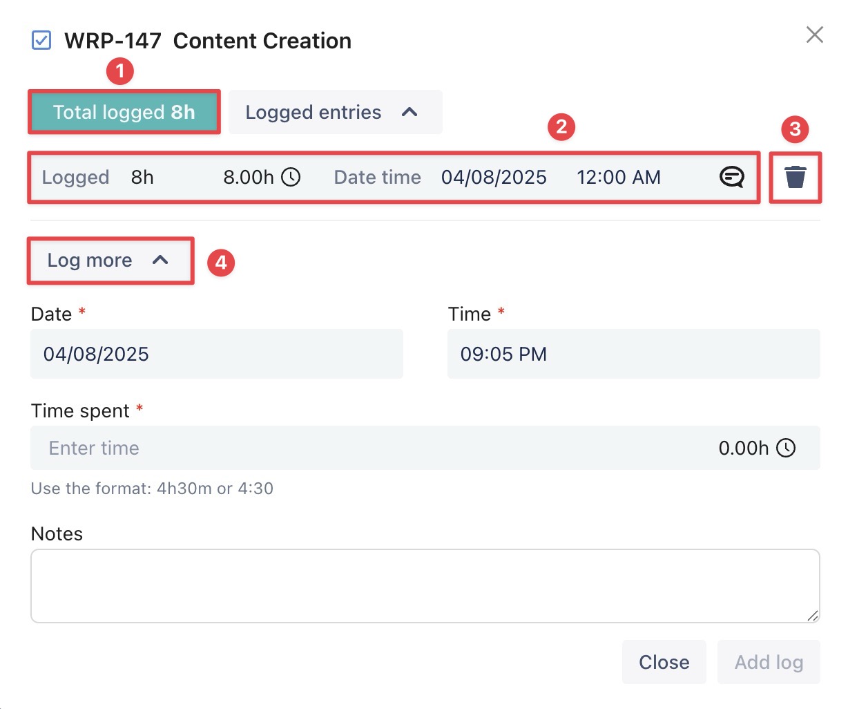 ) to open the timelog details --> Update the time spent, date time, or add/edit notes as needed.