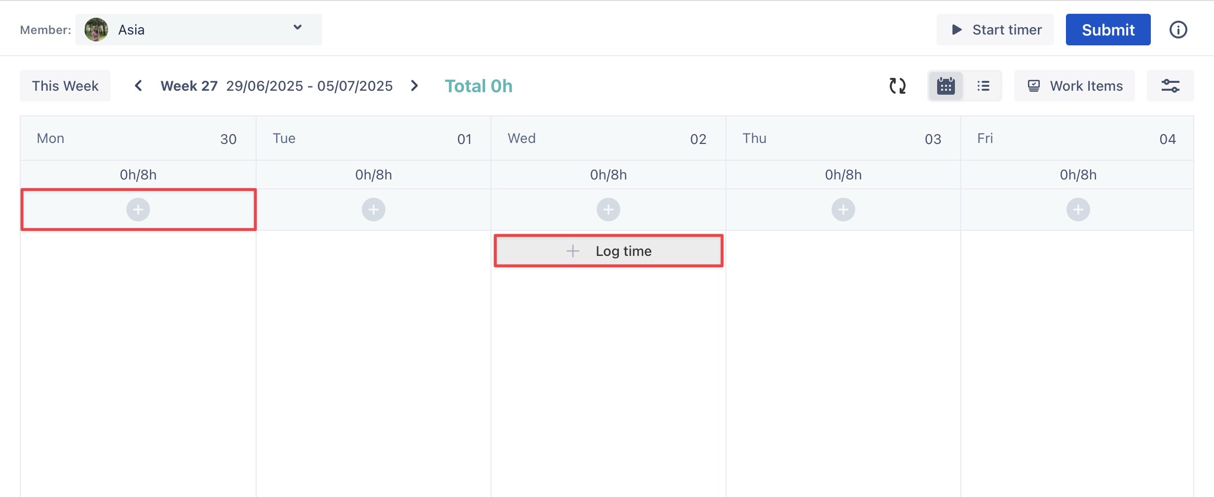 Log Time using the Start Timer