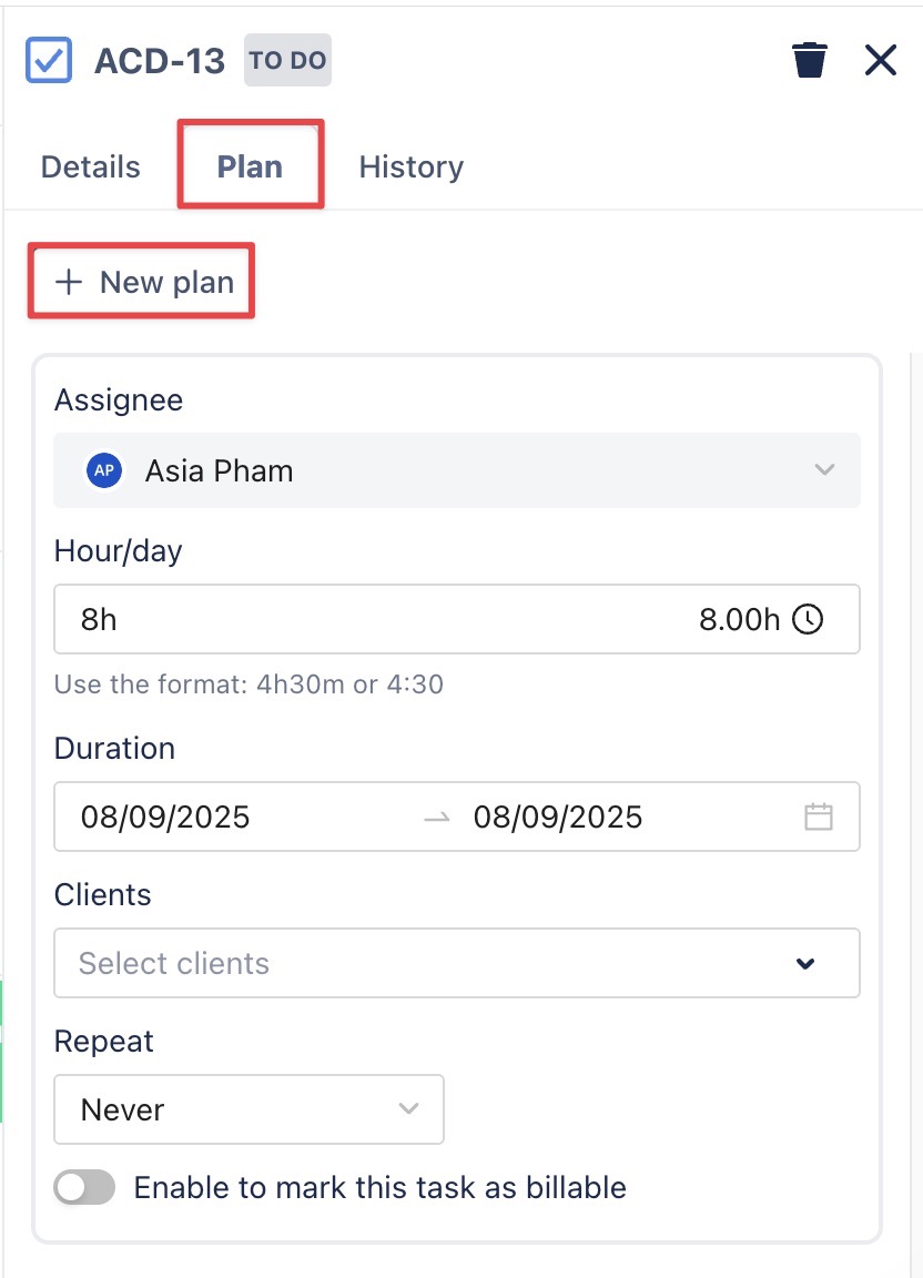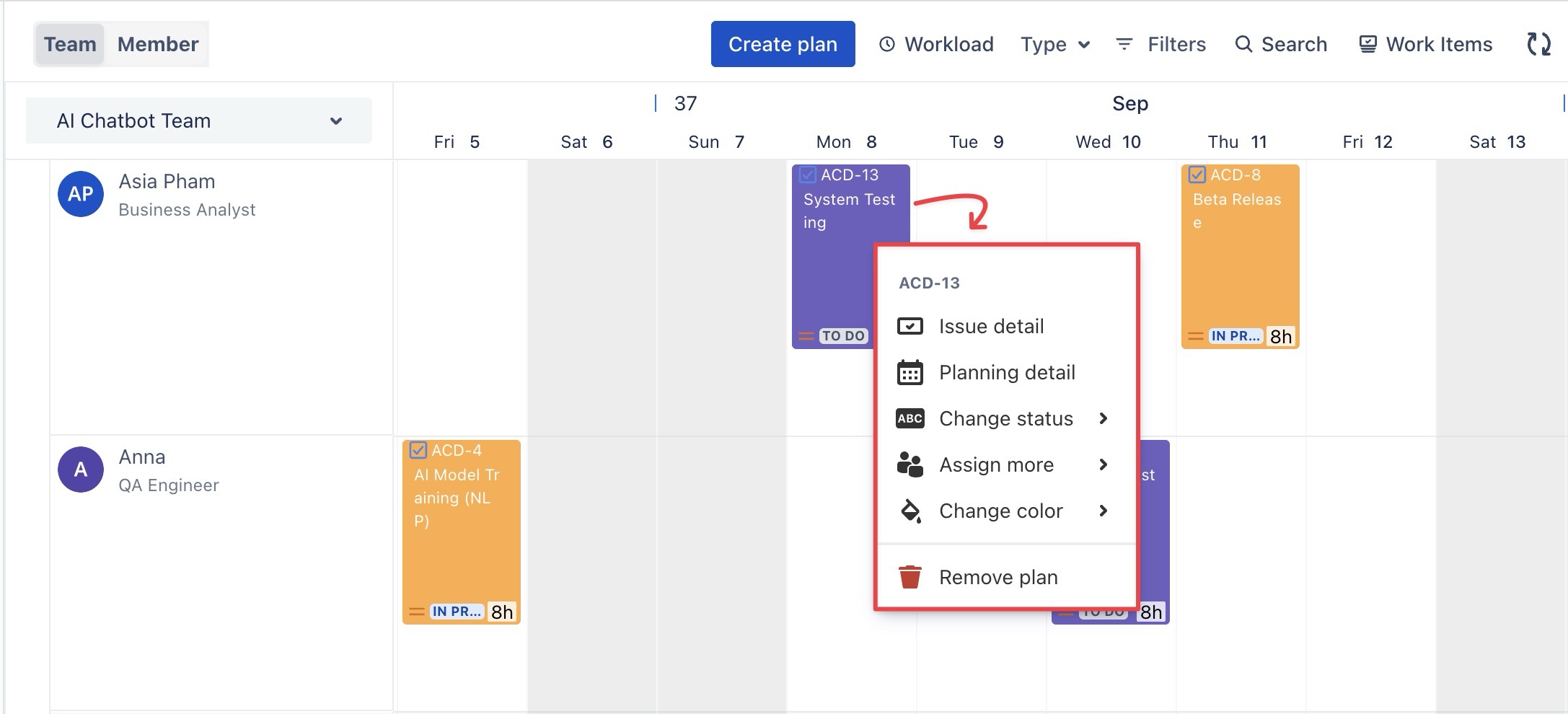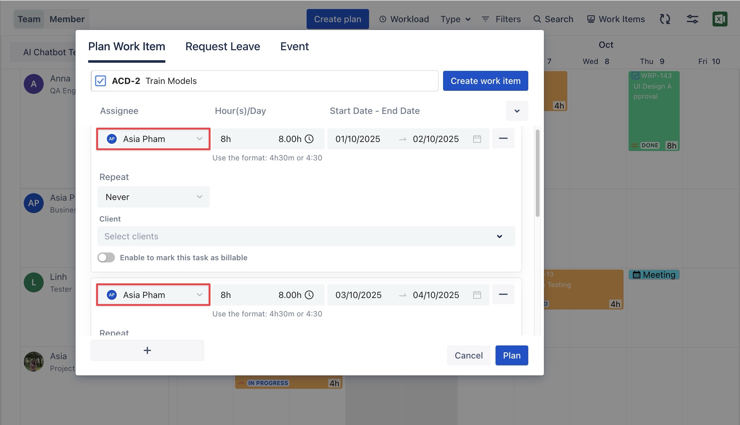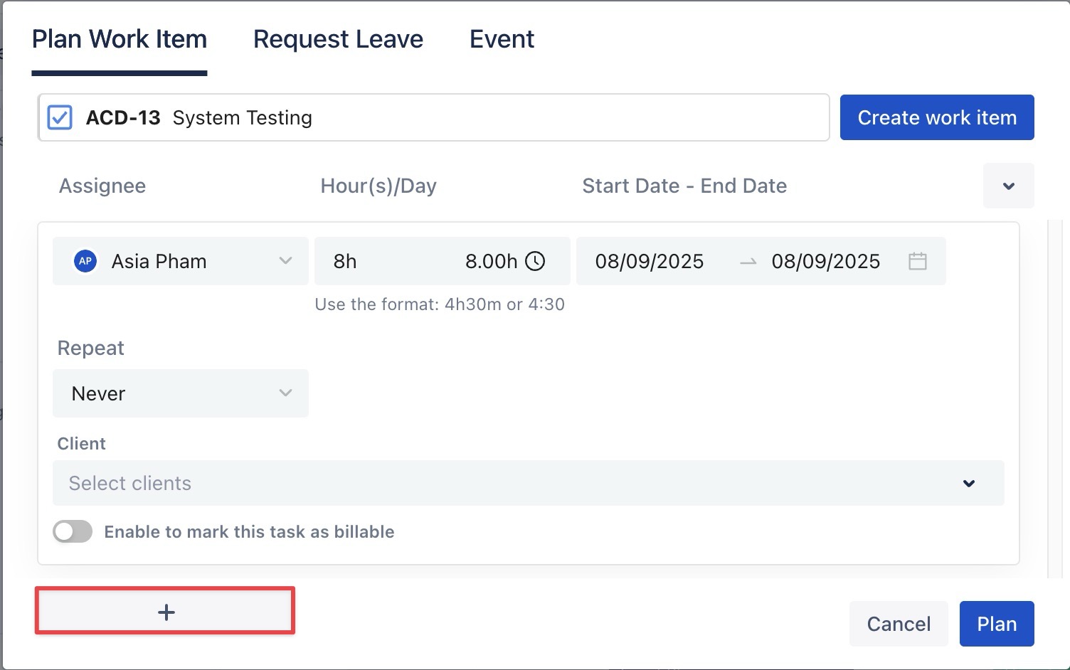 TeamBoard TimePlanner allows users to plan tasks directly within the Work Item Detail panel without needing to switch to the TimePlanner app. You can also assign tasks to multiple assignees using the Work Item Detail panel. Follow these simple steps: