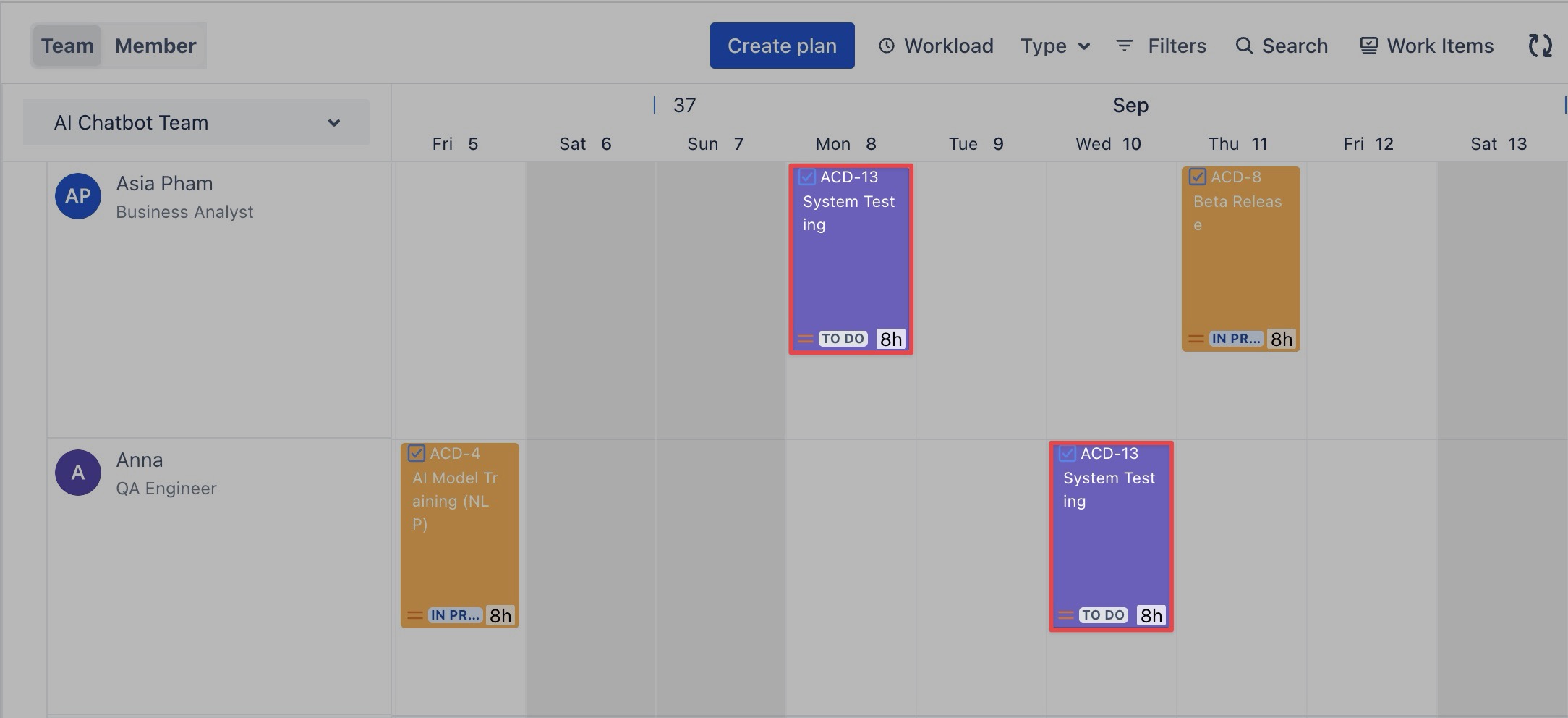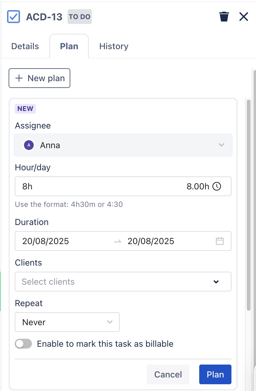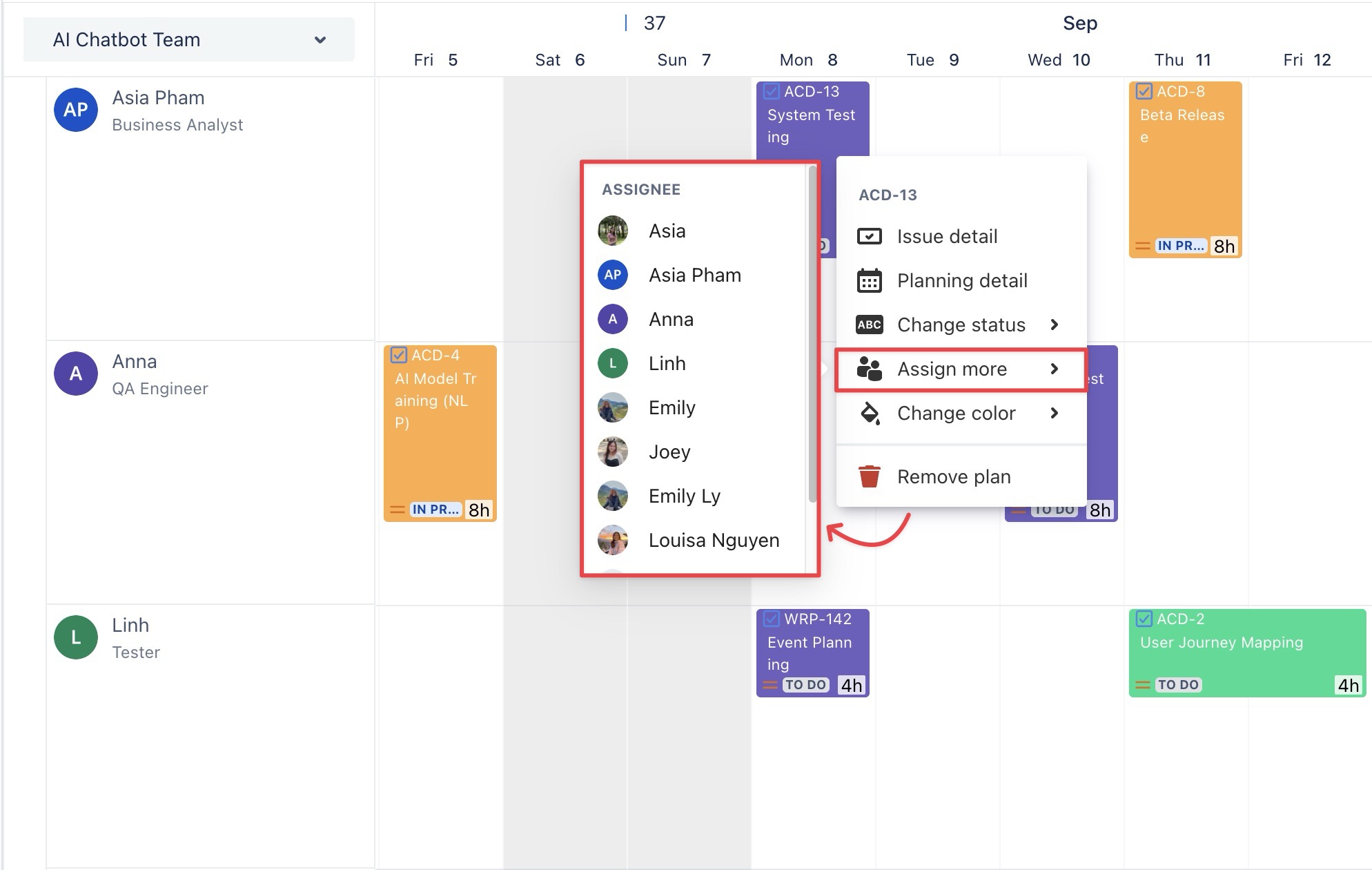 By default, Jira only allows a single assignee for each task. However, TeamBoard TimePlanner enables you to assign a task to multiple assignees. This feature is useful for tasks that require collaboration across different team members, allowing for a more flexible and efficient distribution of work.