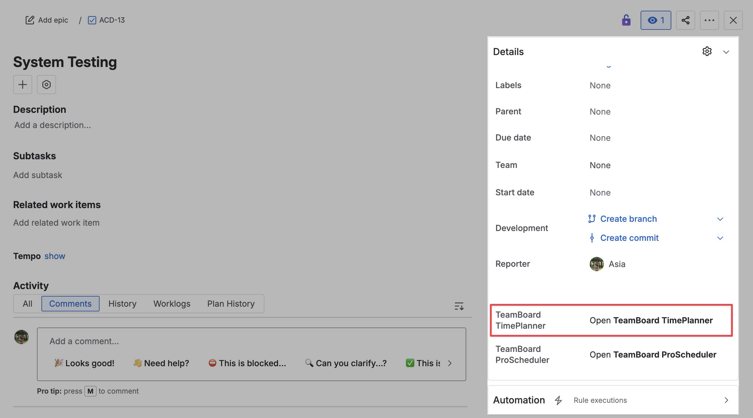 In the right-hand panel, click Open TeamBoard TimePlanner. This opens the planning section for the selected task.