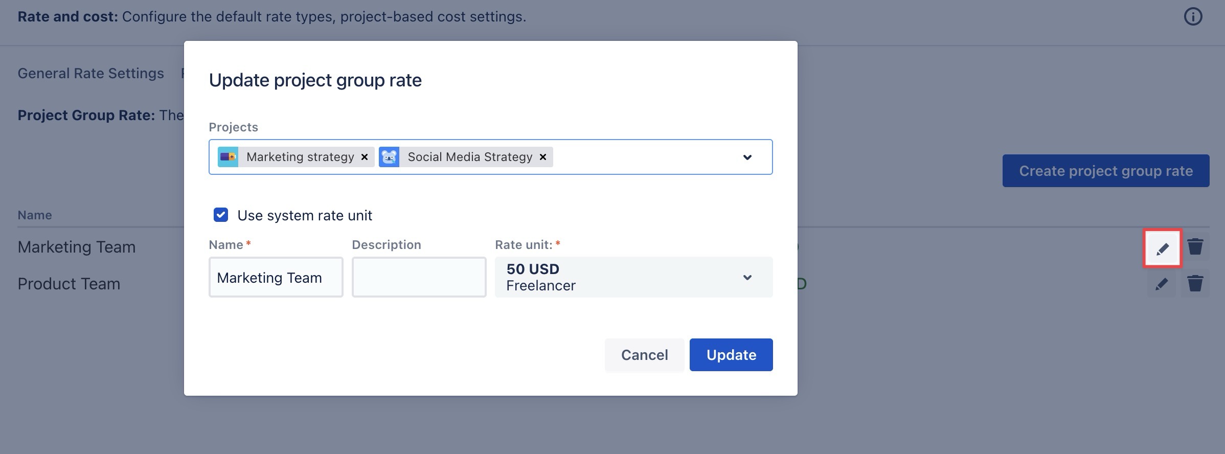 at the end of the row.In the pop-up window, make the necessary changes to the fields: Projects, Name, Description and Rate Unit.