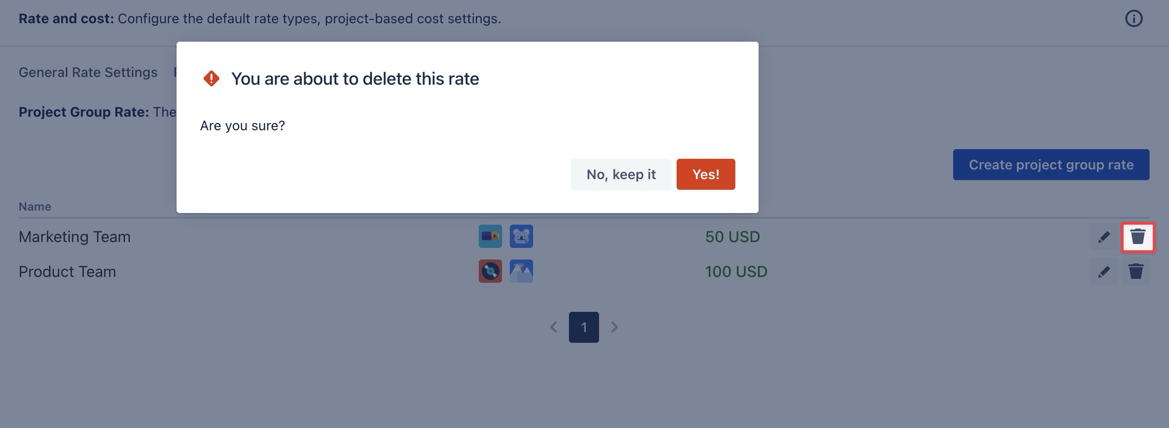 On the Project Group Rate page, find the rate you want to delete.