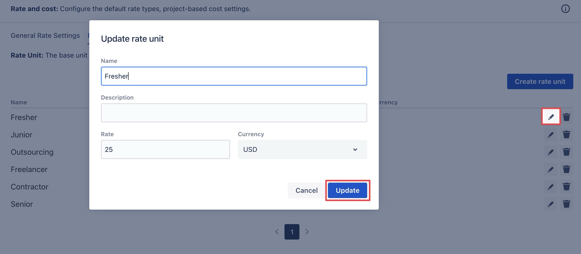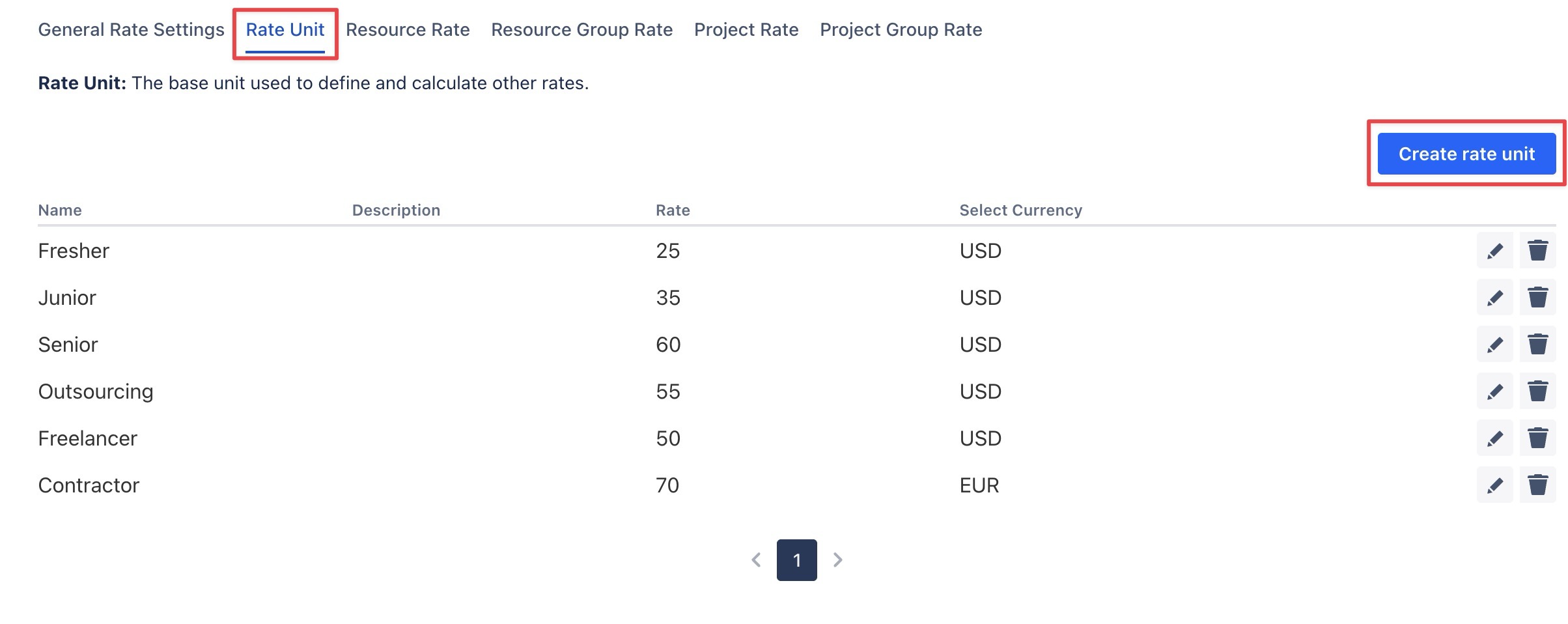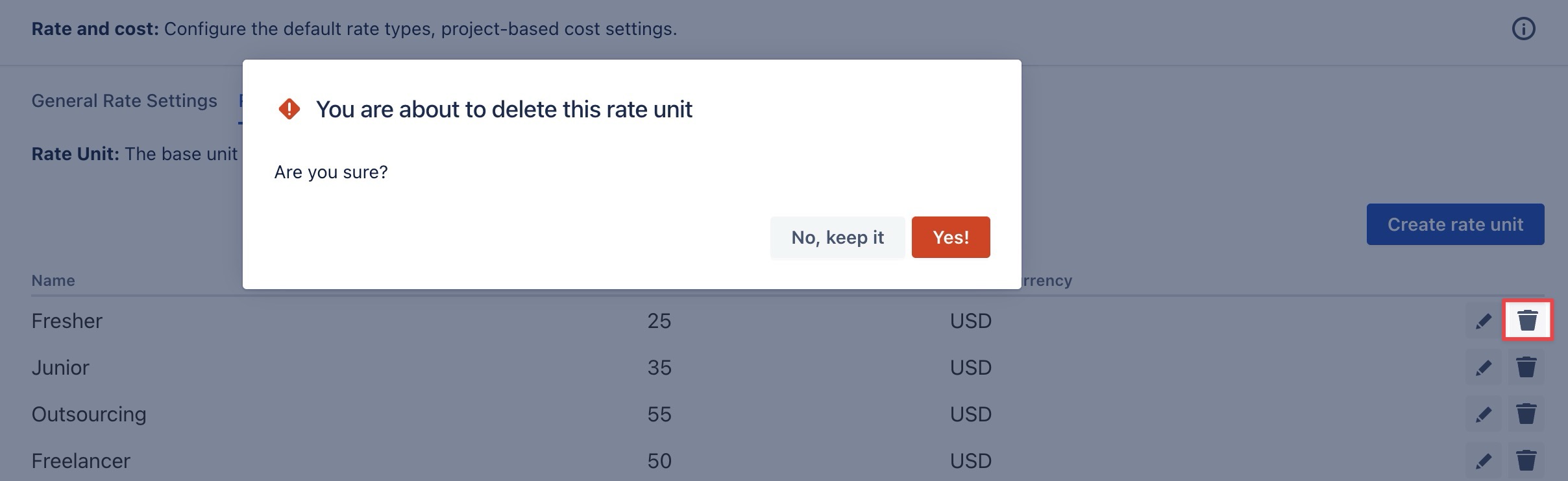 Note: Be cautious when deleting rate units, as it will remove the unit from all associated resources, groups, or projects where it was applied.