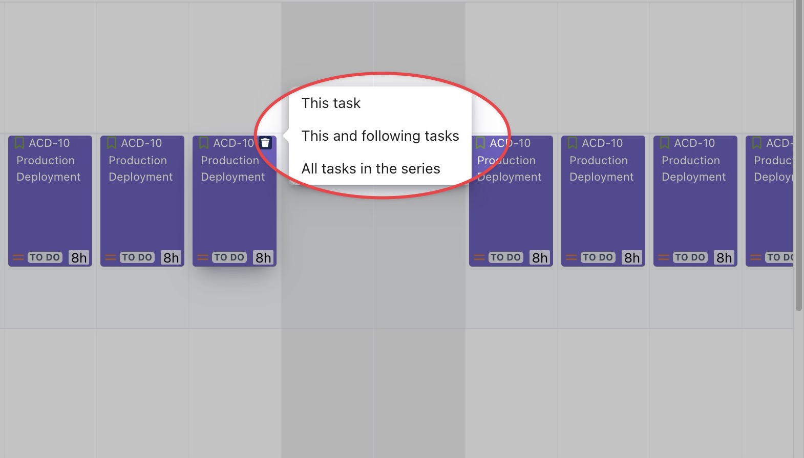 Hover over a task card that belongs to the recurring series you want to remove.