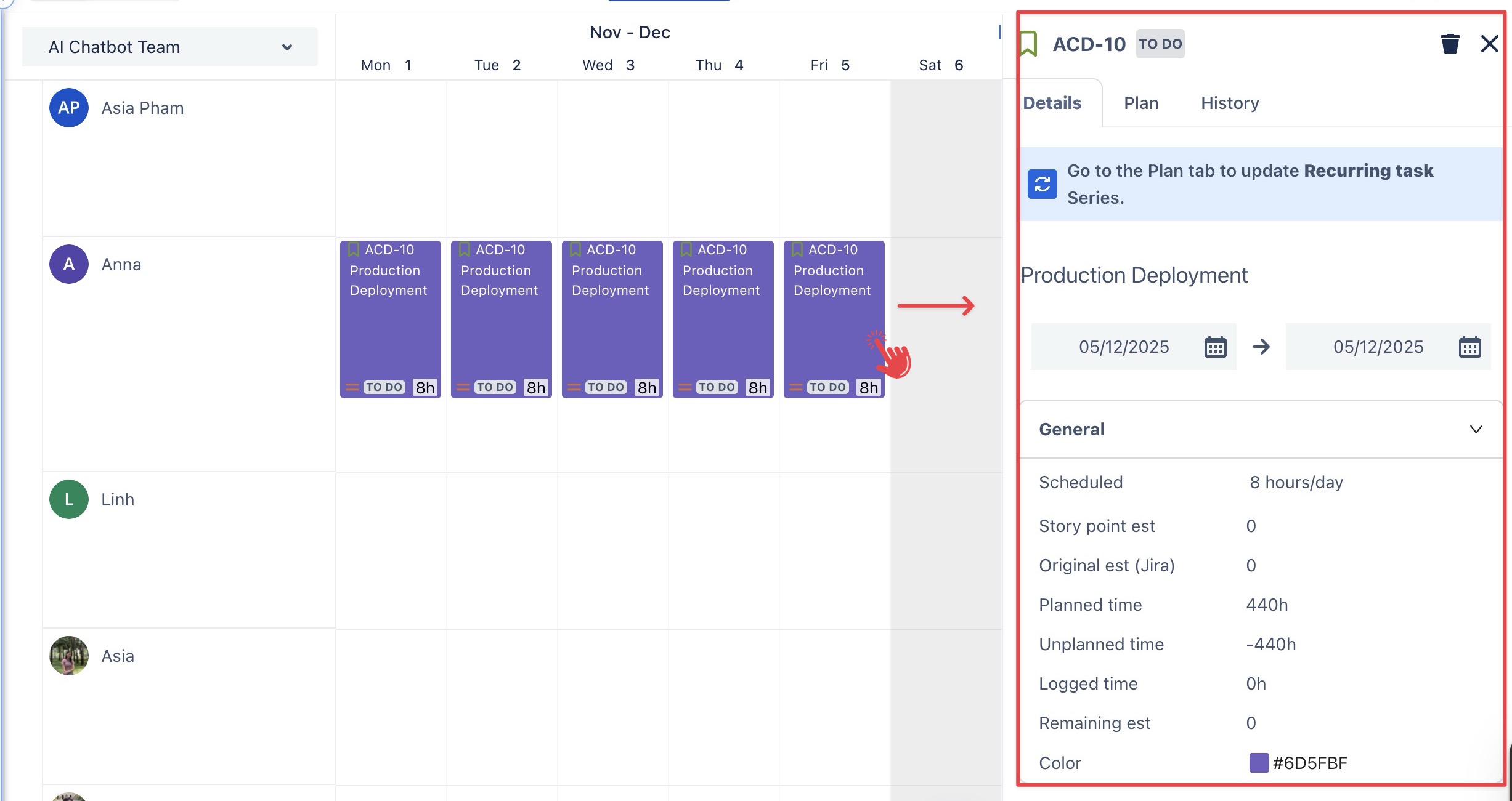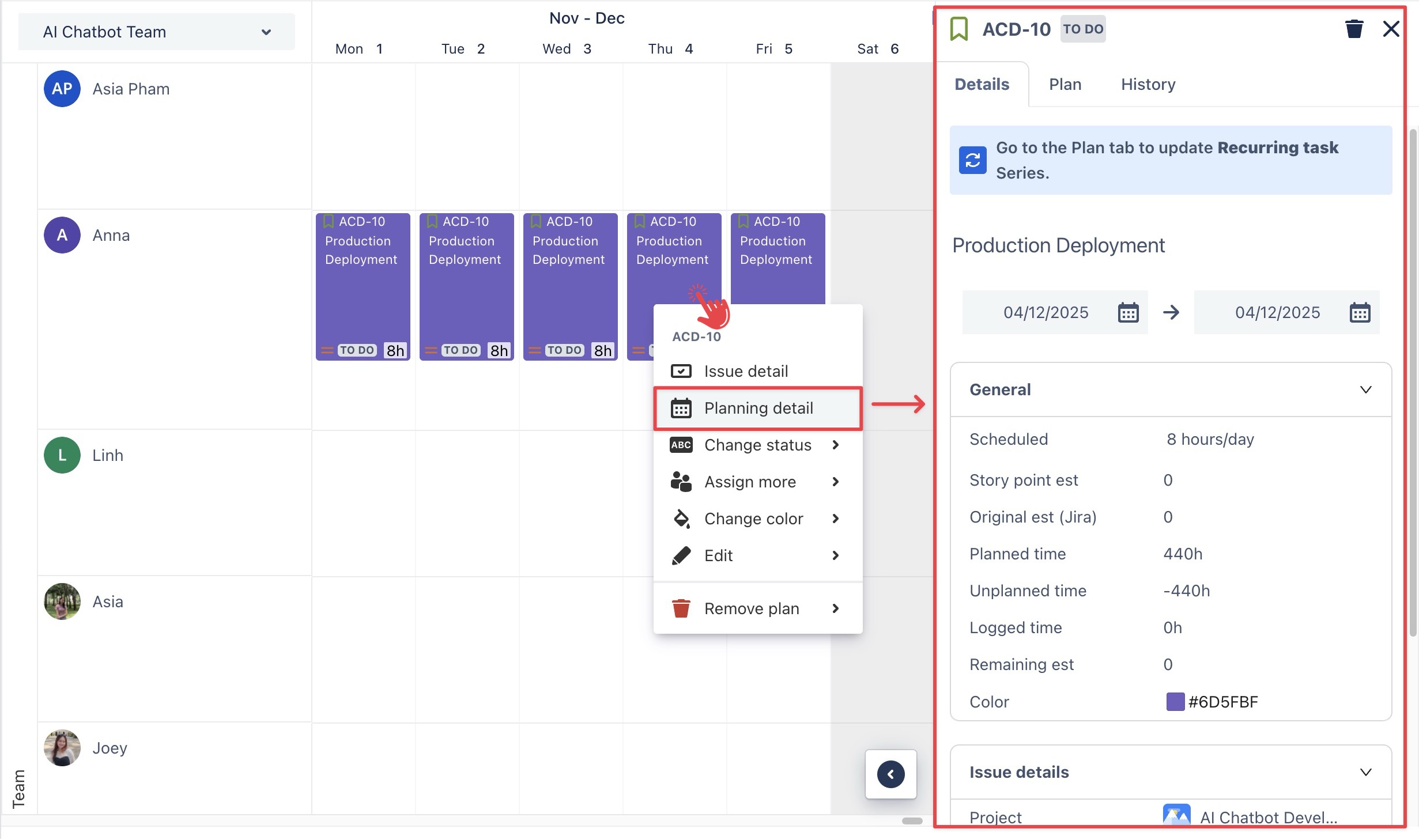 Click directly on a task card to open the Planning Detail Panel.