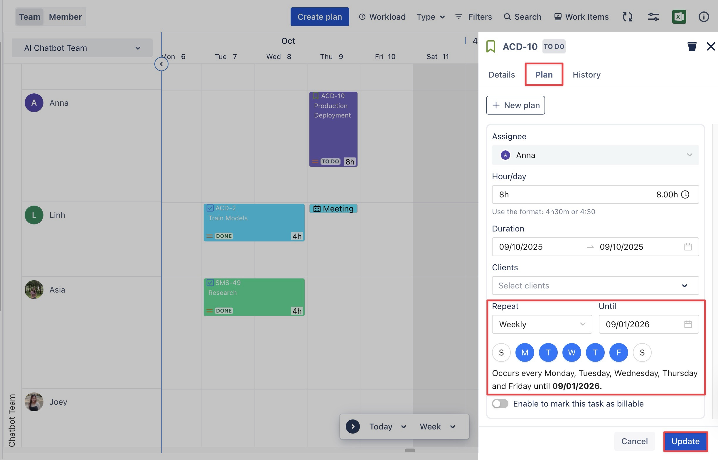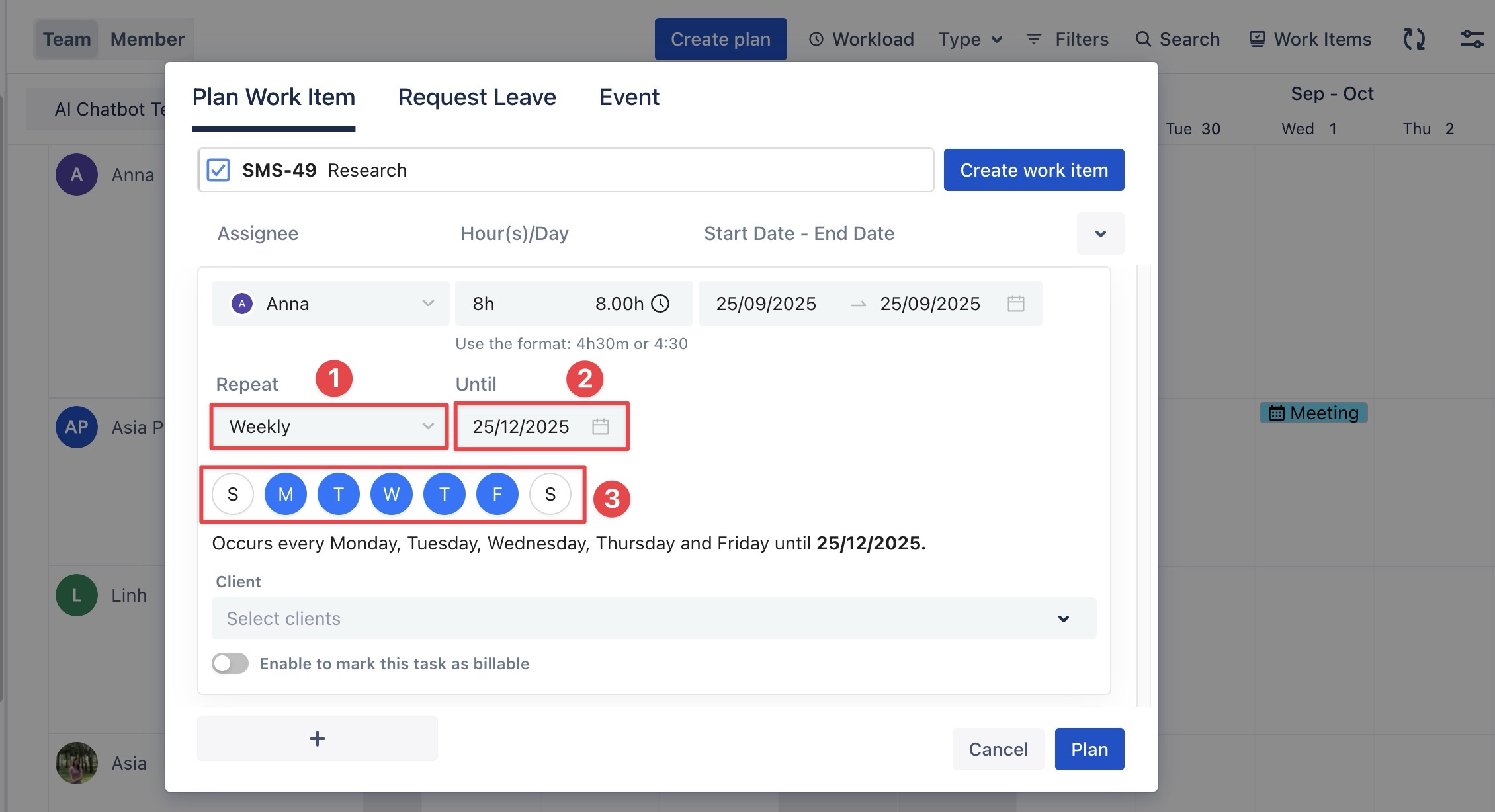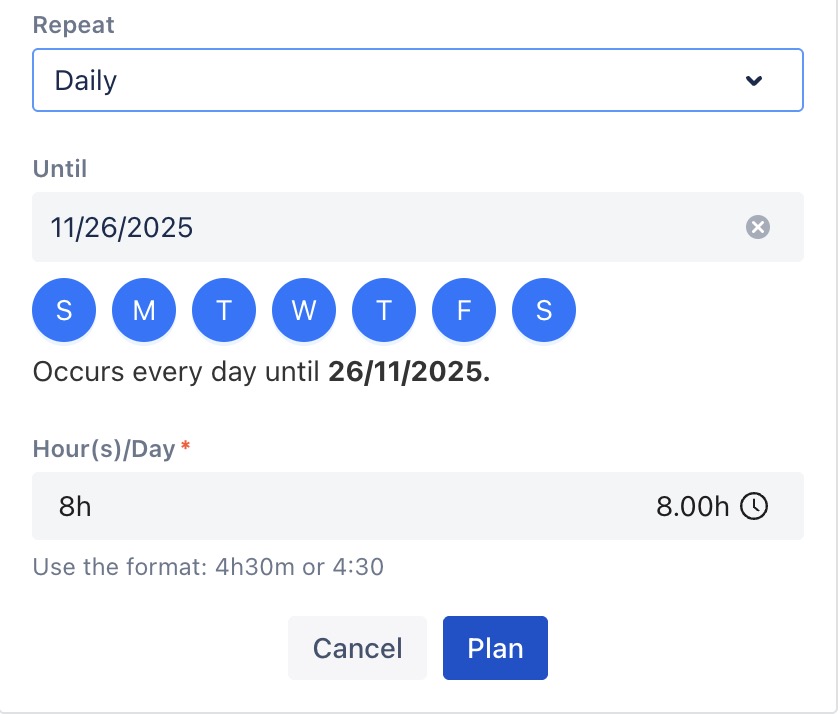 STEP 2 Go to the Plan tab, click on the Repeat field to configure the recurrence: