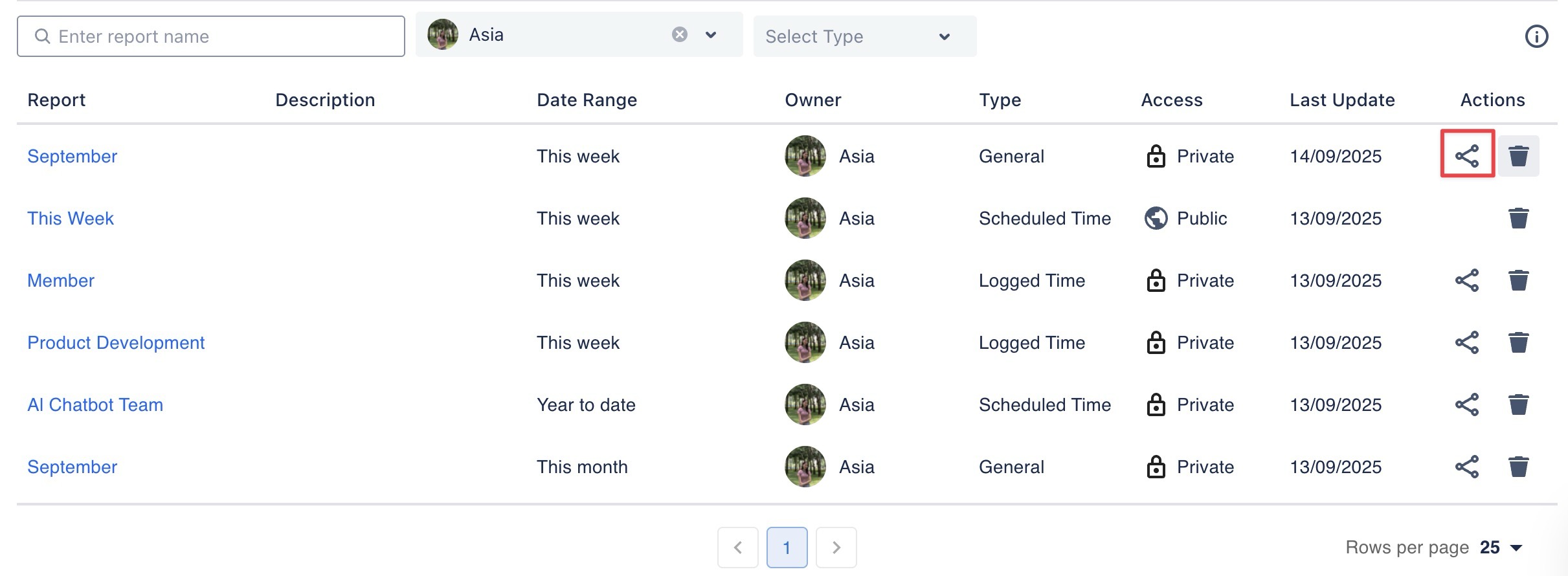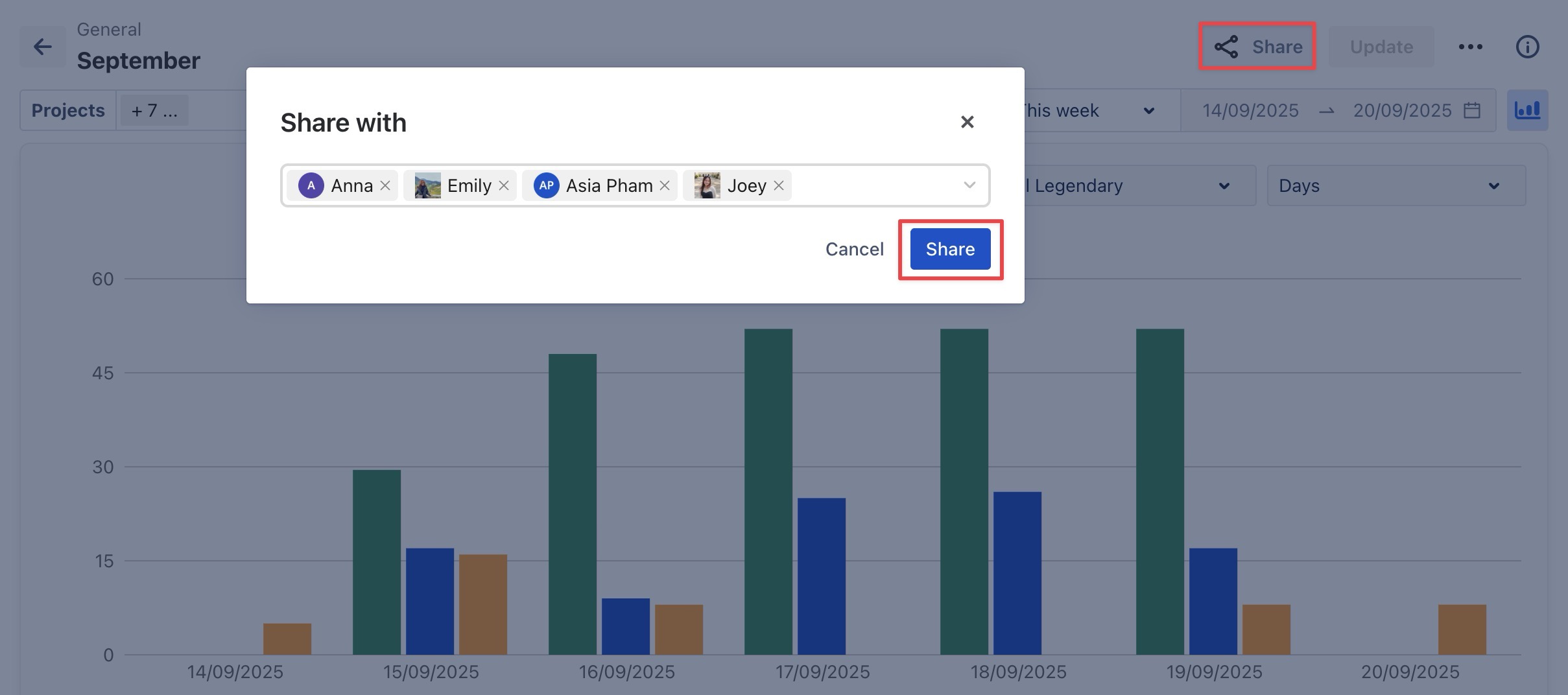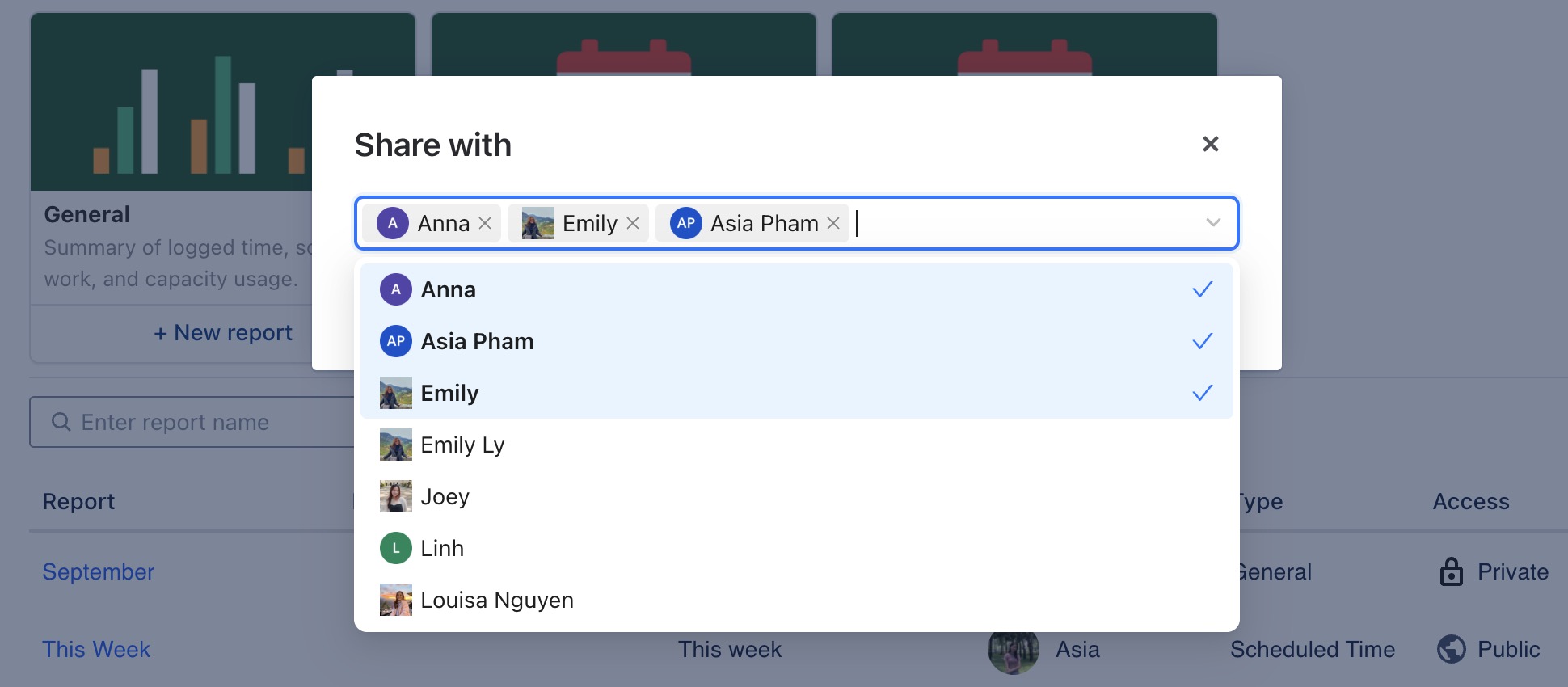 The Share function in TimePlanner allows you to give teammates or stakeholders access to private reports without making them public. This is useful for sharing specific insights while keeping visibility restricted.