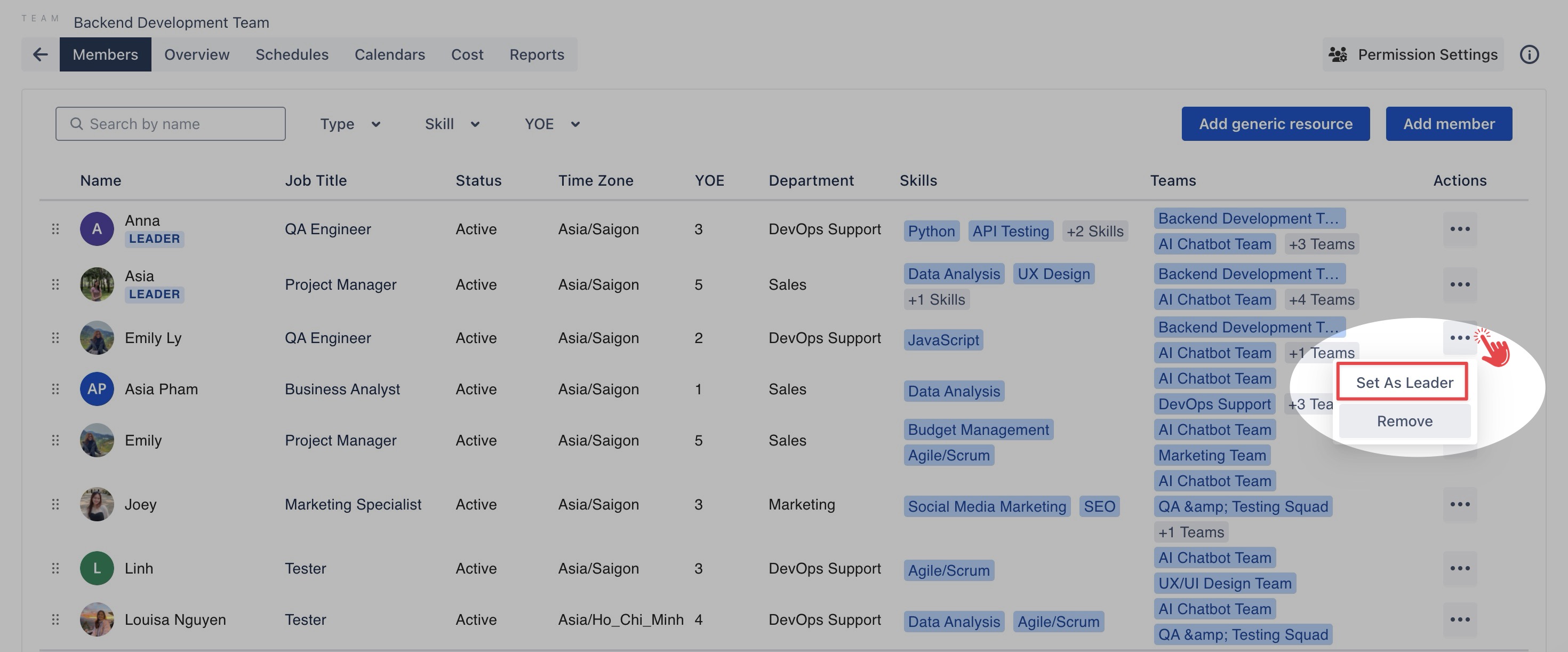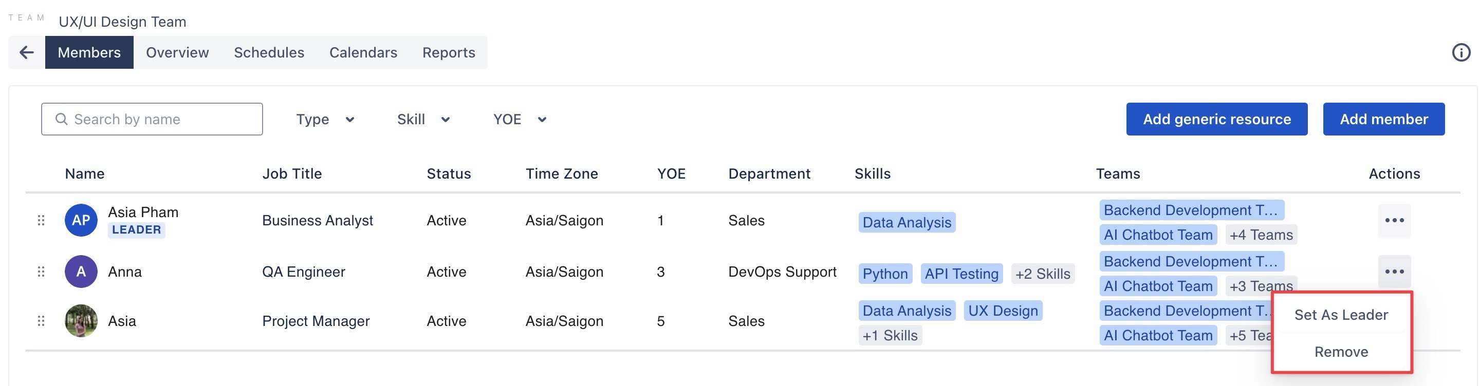 As a Team Leader, you can manage team schedules: