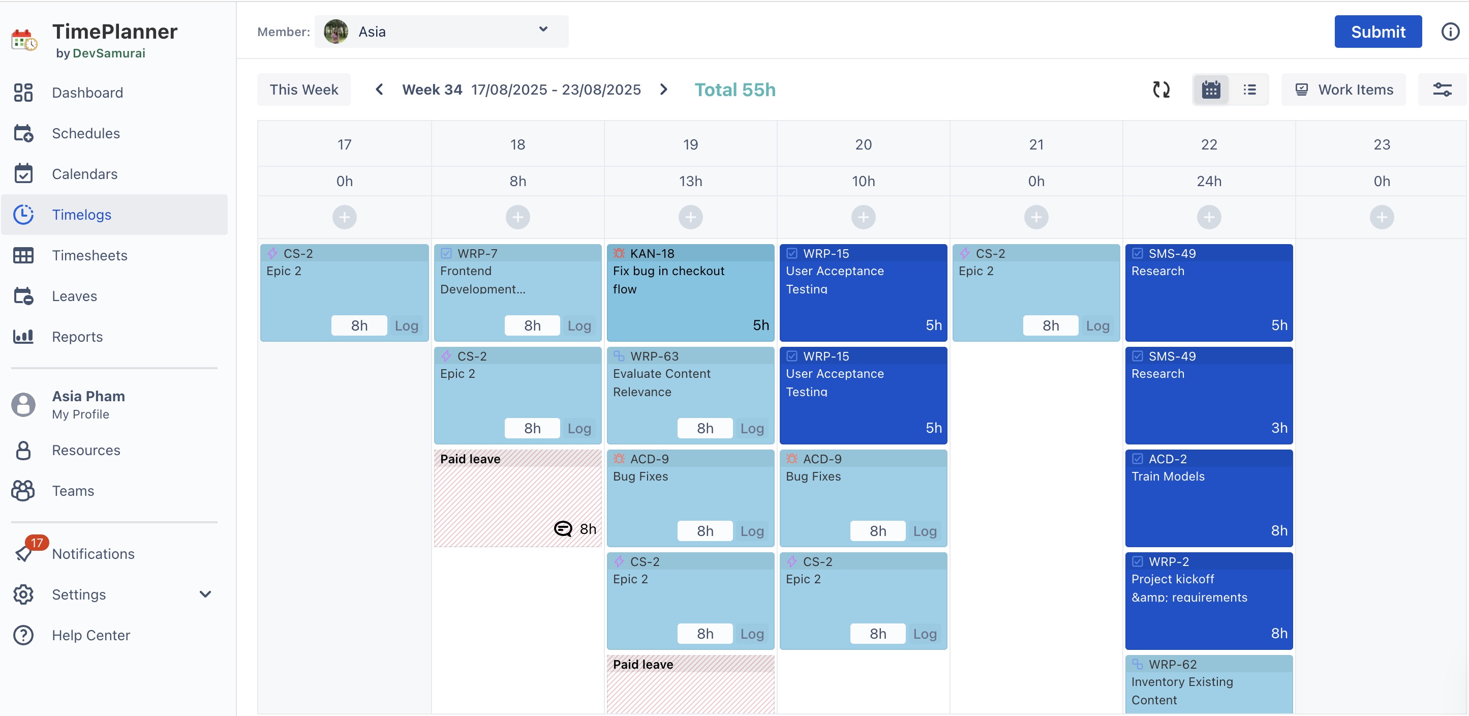 View Work Logs: See logged hours of team members across Timelog, Reports, and Dashboard.