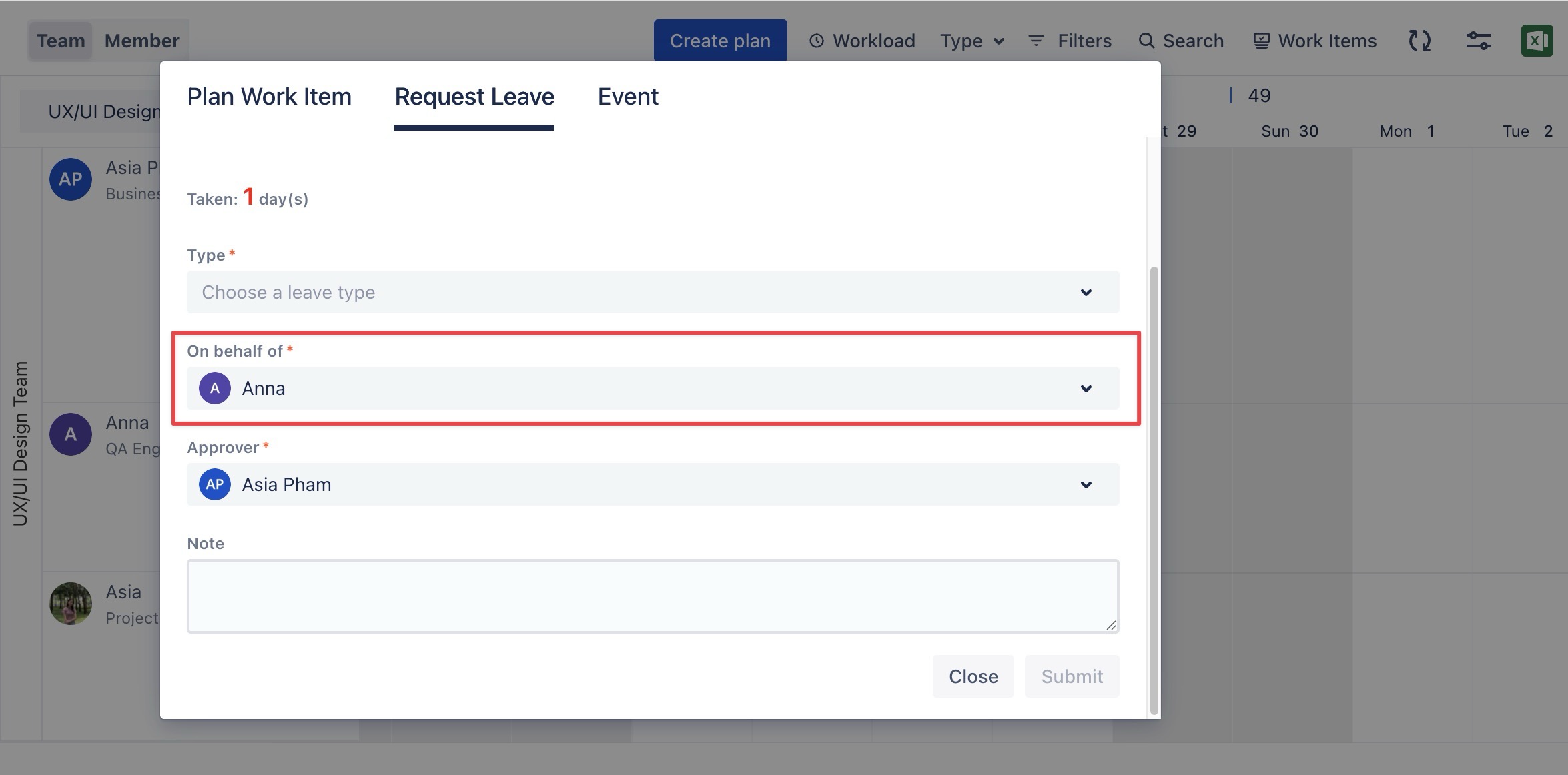 ‘Submit leave requests on behalf of members’: Allows creating and submitting leave requests for team members.