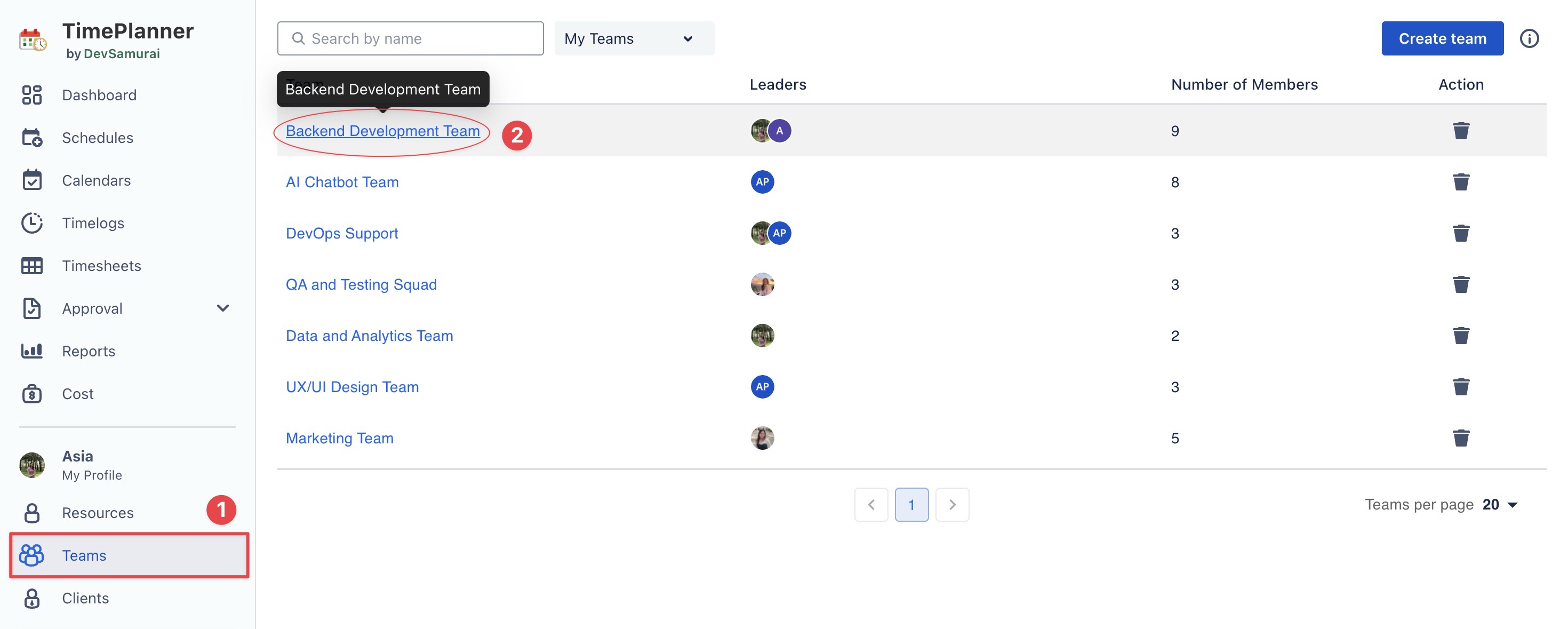 As the Team Admin, the user can create new teams and view all teams in TeamBoard TimePlanner. Additionally, users will have full control over resource allocation within teams and can access team data.