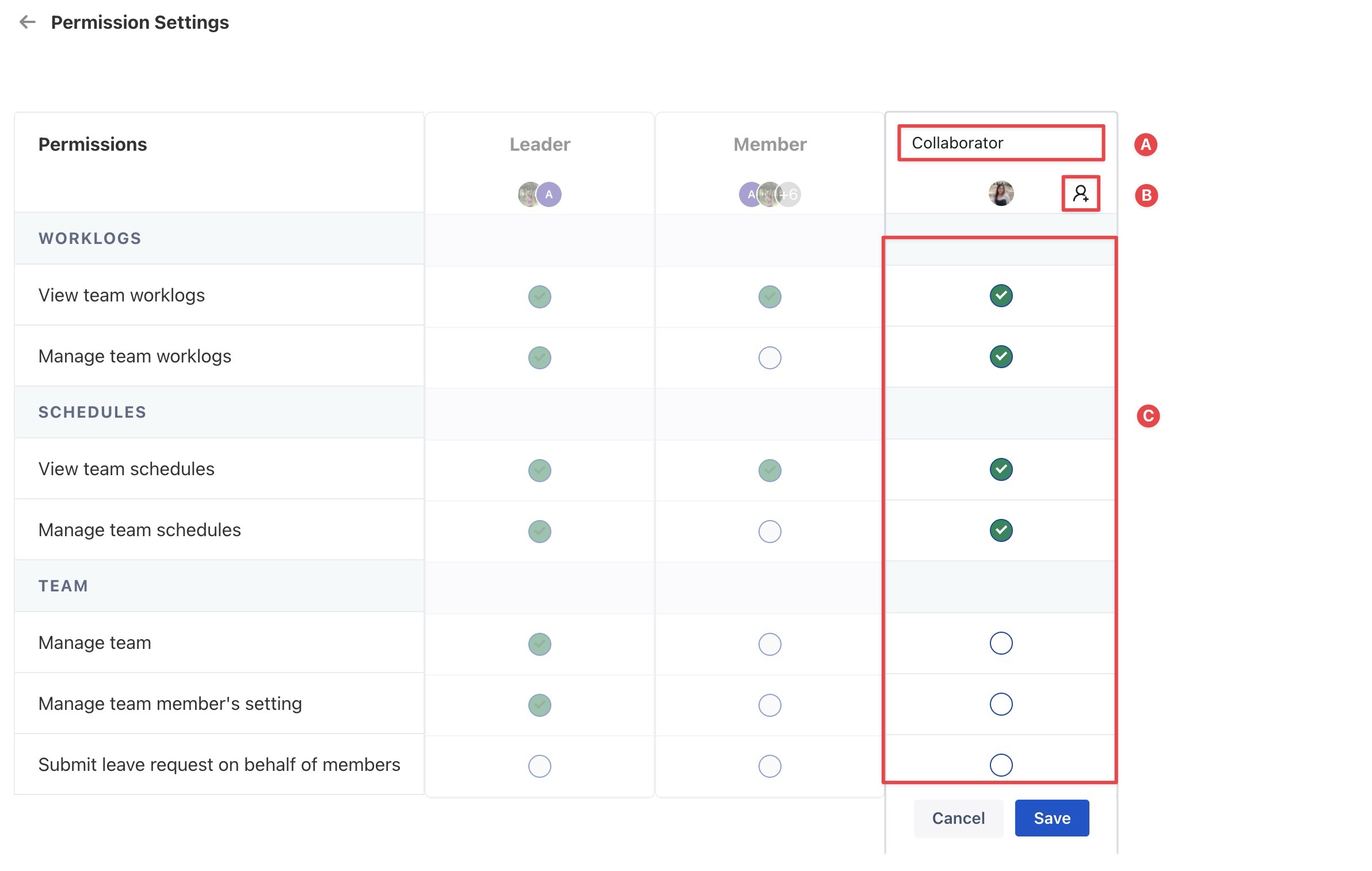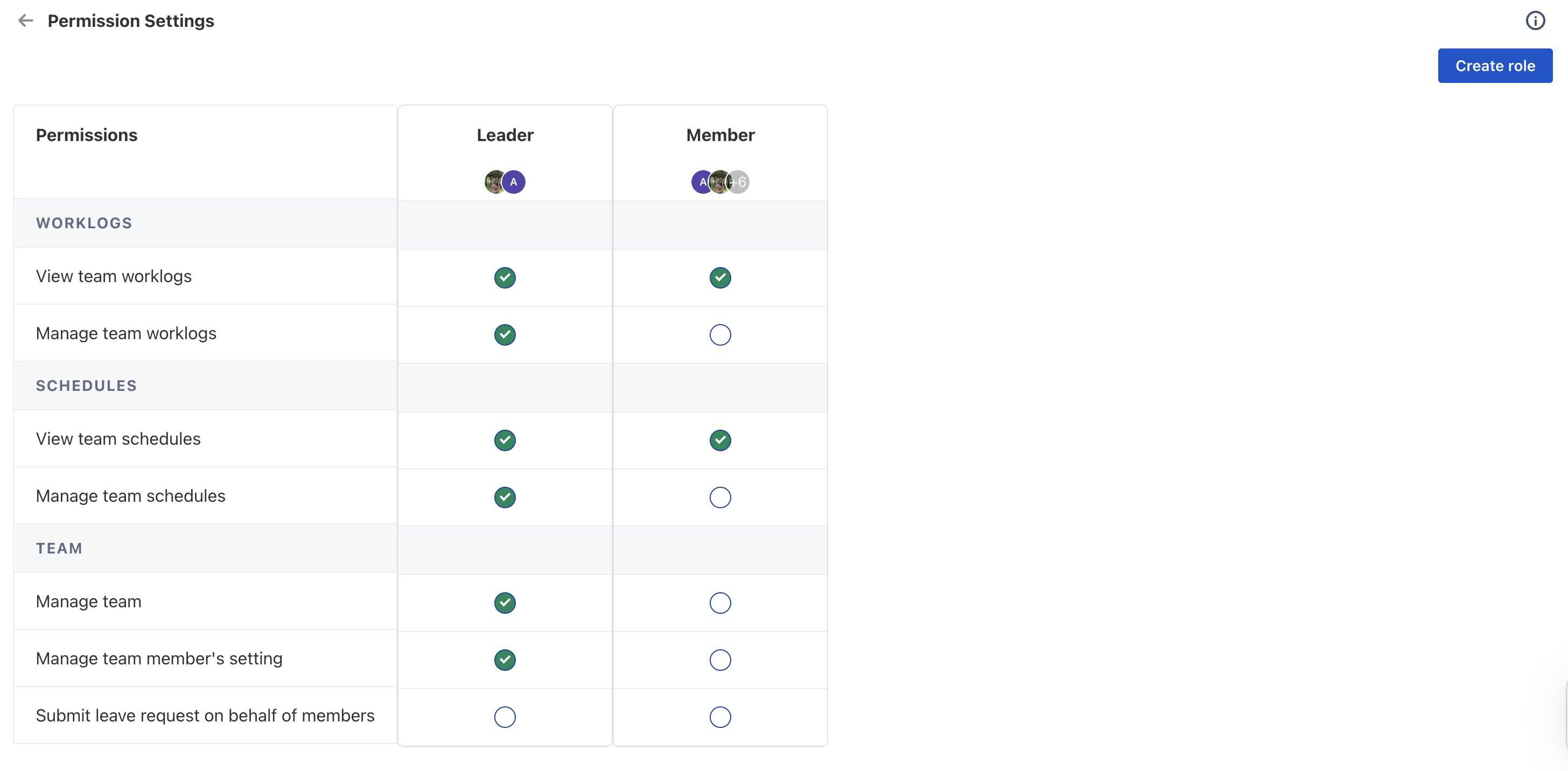 Manage team member settings | Allows updating holidays, capacity, default approvers, and monitoring leave balances. | |