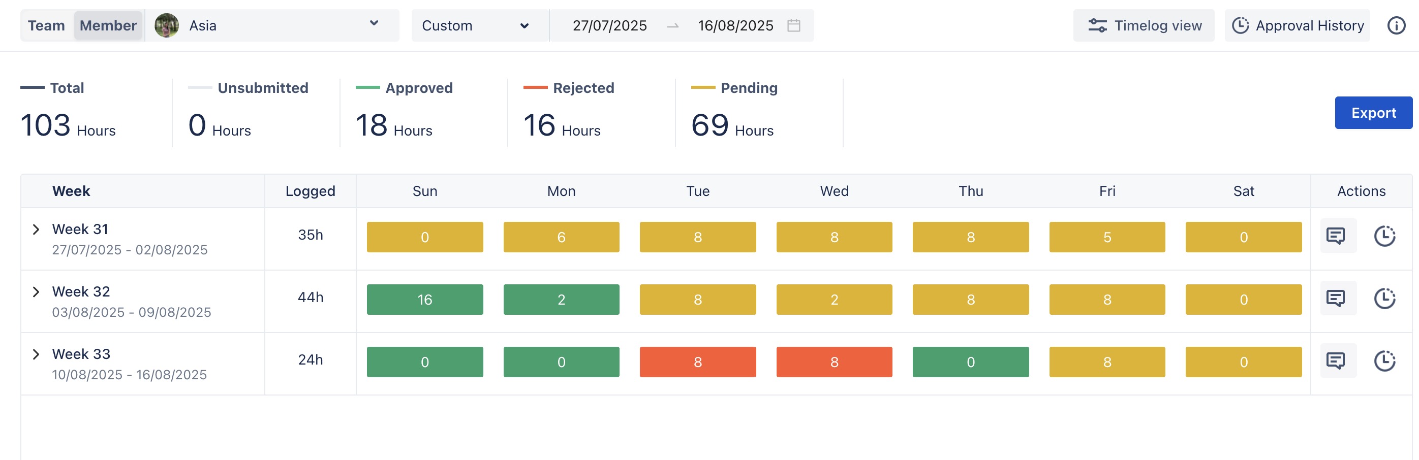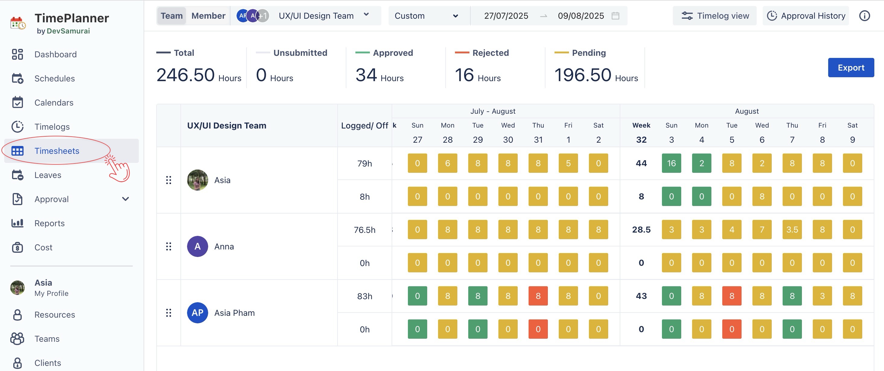 Team Timesheets: You can switch to the team view to see the aggregated hours and statuses of your team members, providing a comprehensive overview of their workloads.