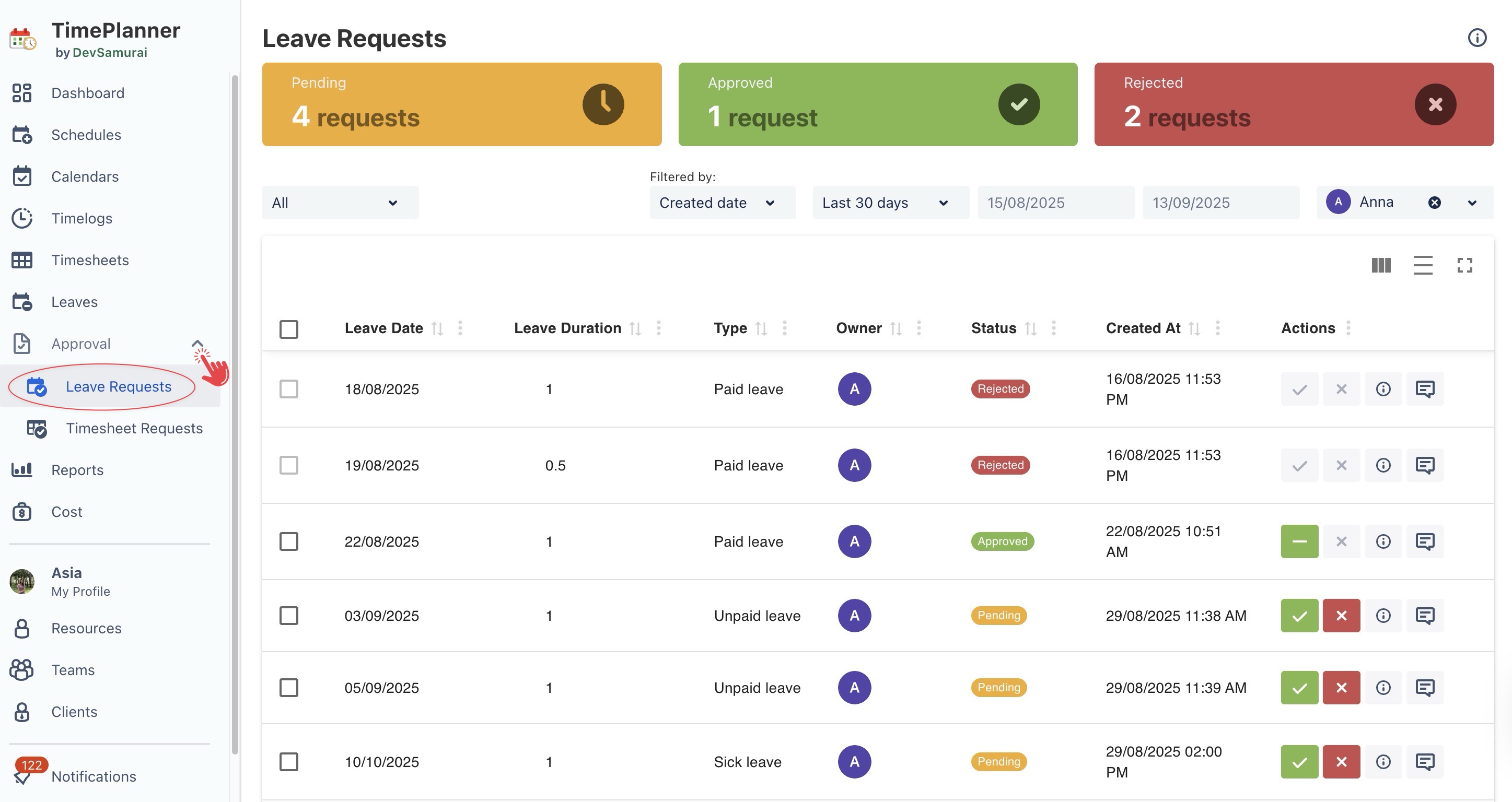 The Leave Approval feature in TeamBoard TimePlanner is designed for managers or designated approvers to review and take action on employee leave requests. Approvers can quickly check pending requests, approve or reject them, and even revoke previously approved leaves when necessary.