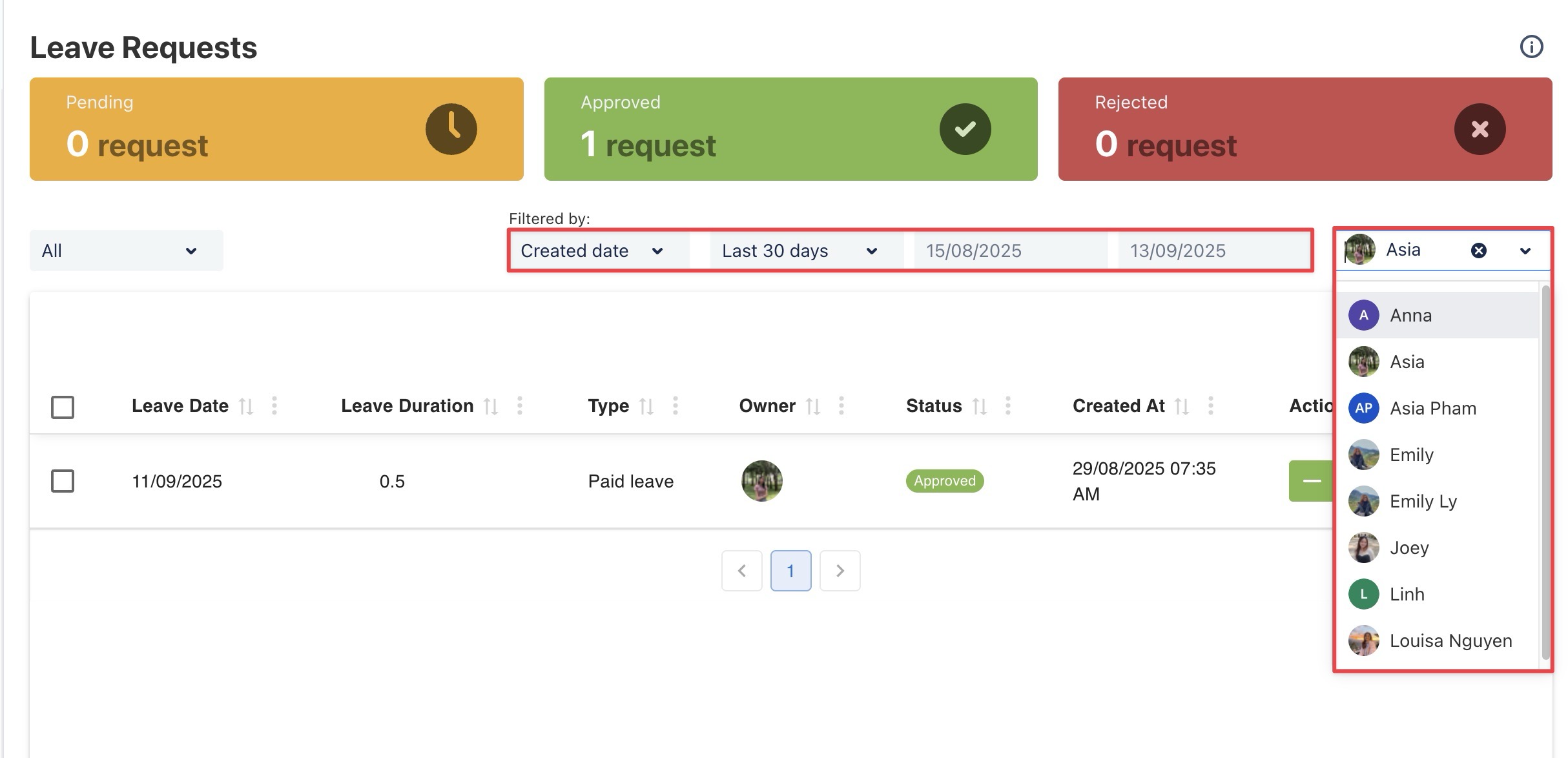 1. On the Leave Requests dashboard, select the date range and the member whose time off you want to review.
