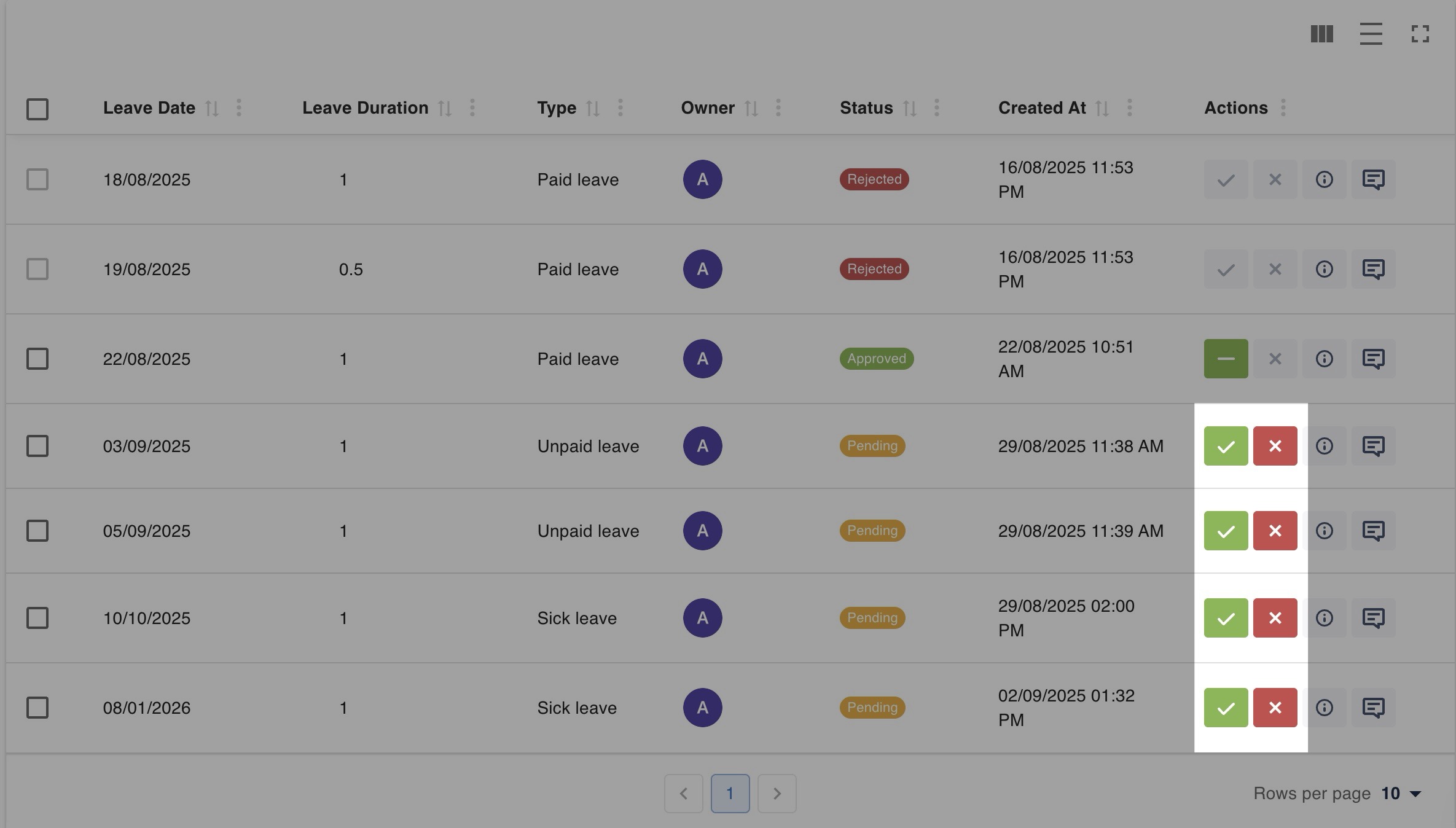 Each request includes details such as the employee’s name, leave type, dates, and any notes provided. Approvers can then take action directly from this page.