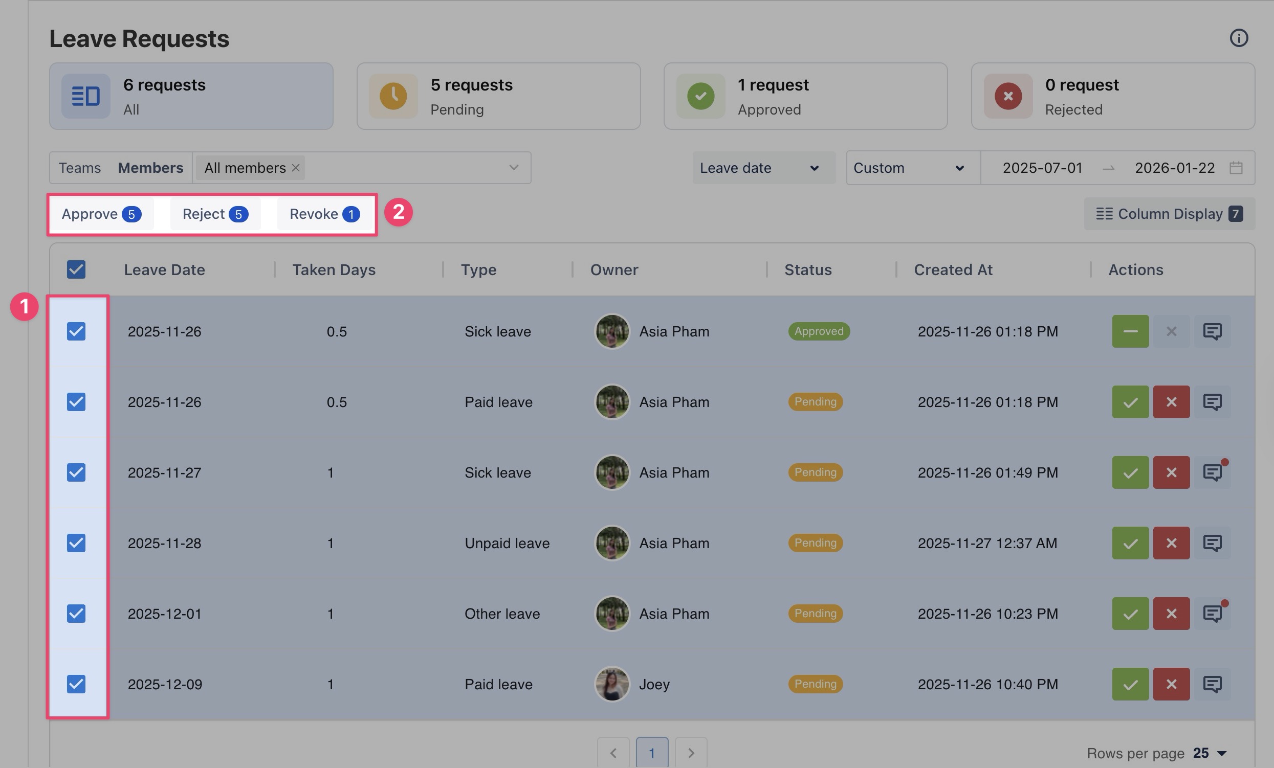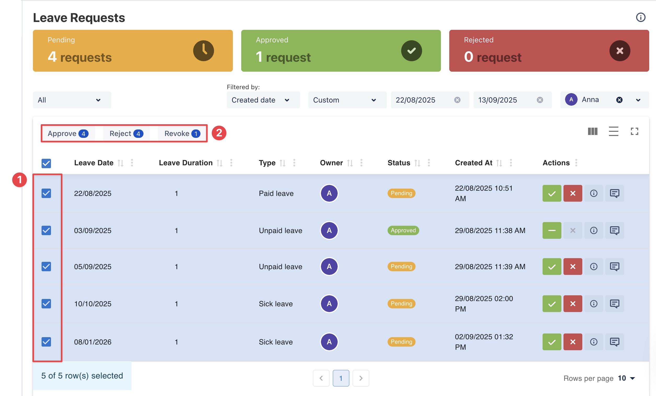 Bulk actions are especially useful during busy leave periods (such as holidays) when many requests are submitted at once.