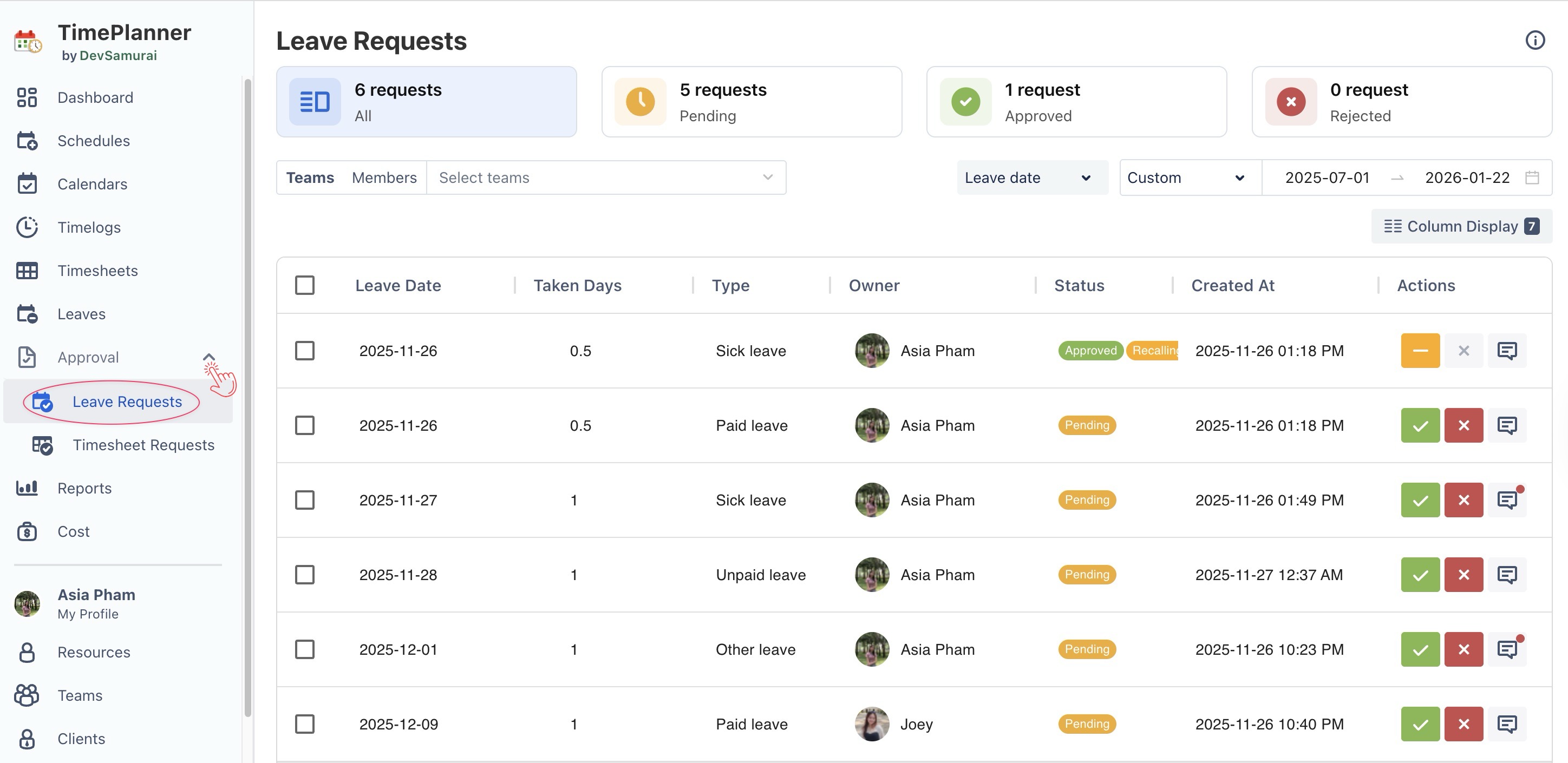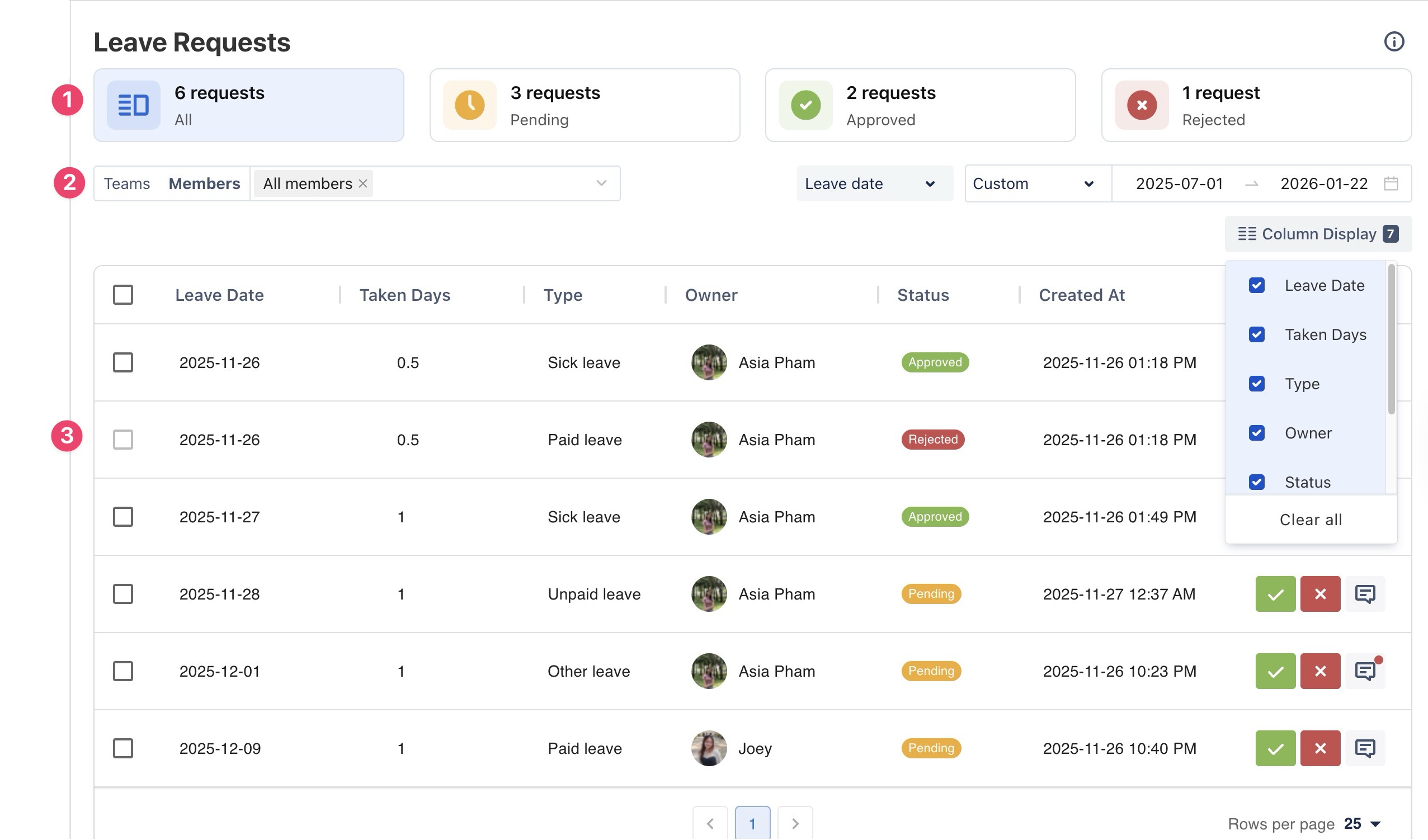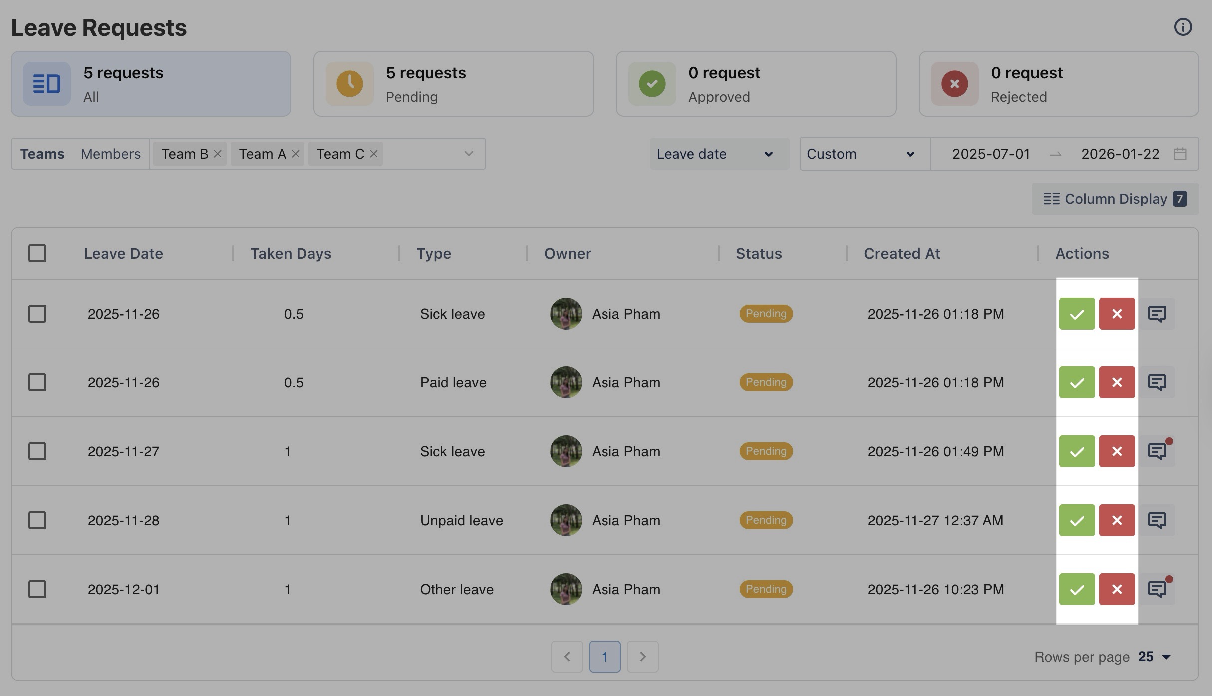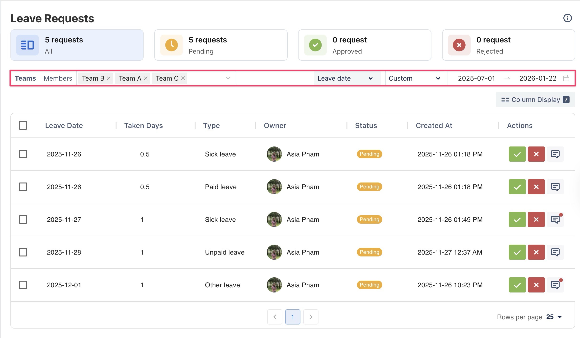 Teams / Members filter – Choose a specific team or individual to view their leave requests.