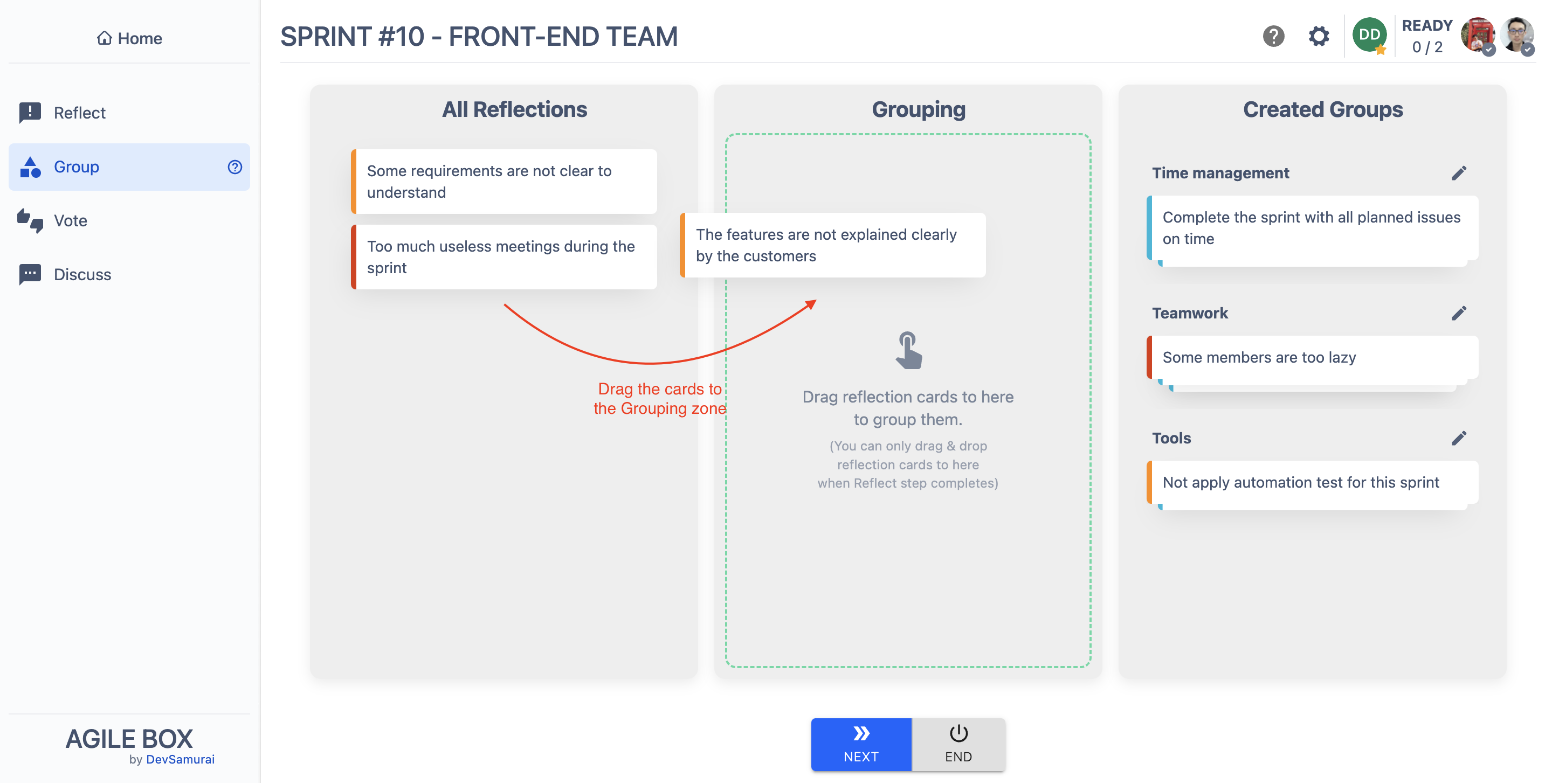 Similar to the REFLECT stage, normal participants (not the facilitator) can click the READY button to inform the facilitator that he/she is ready to the next stage 🔔.