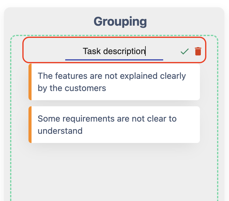The facilitator drag the cards which have the matched content to the Grouping column. ONLY the facilitator is allowed to do this stage, others can view the process.