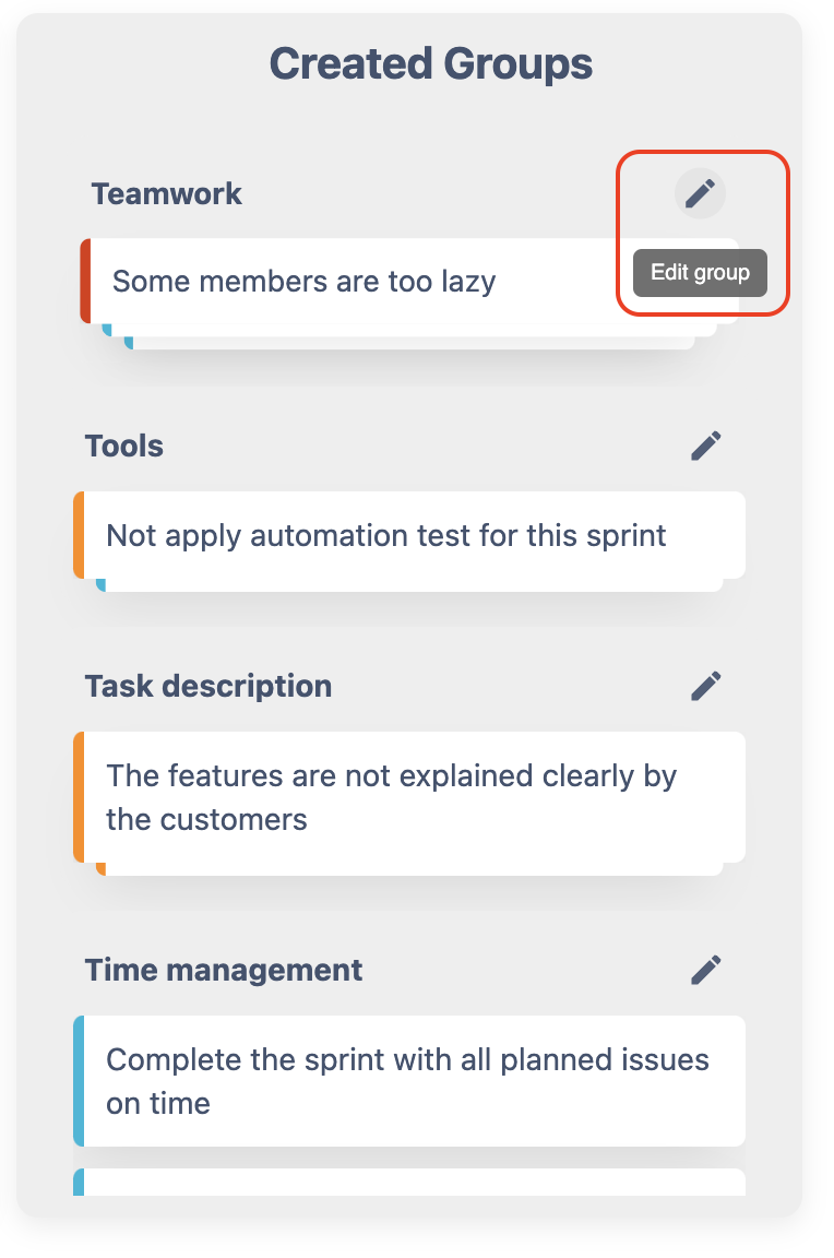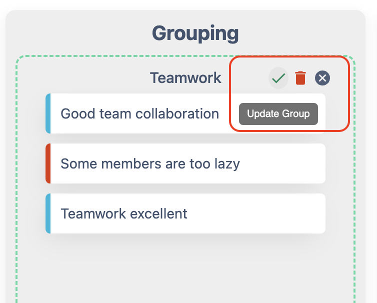 Then, the facilitator can drag the cards back to All Reflections column, rename the title or delete the group if he/she wants to update the group.