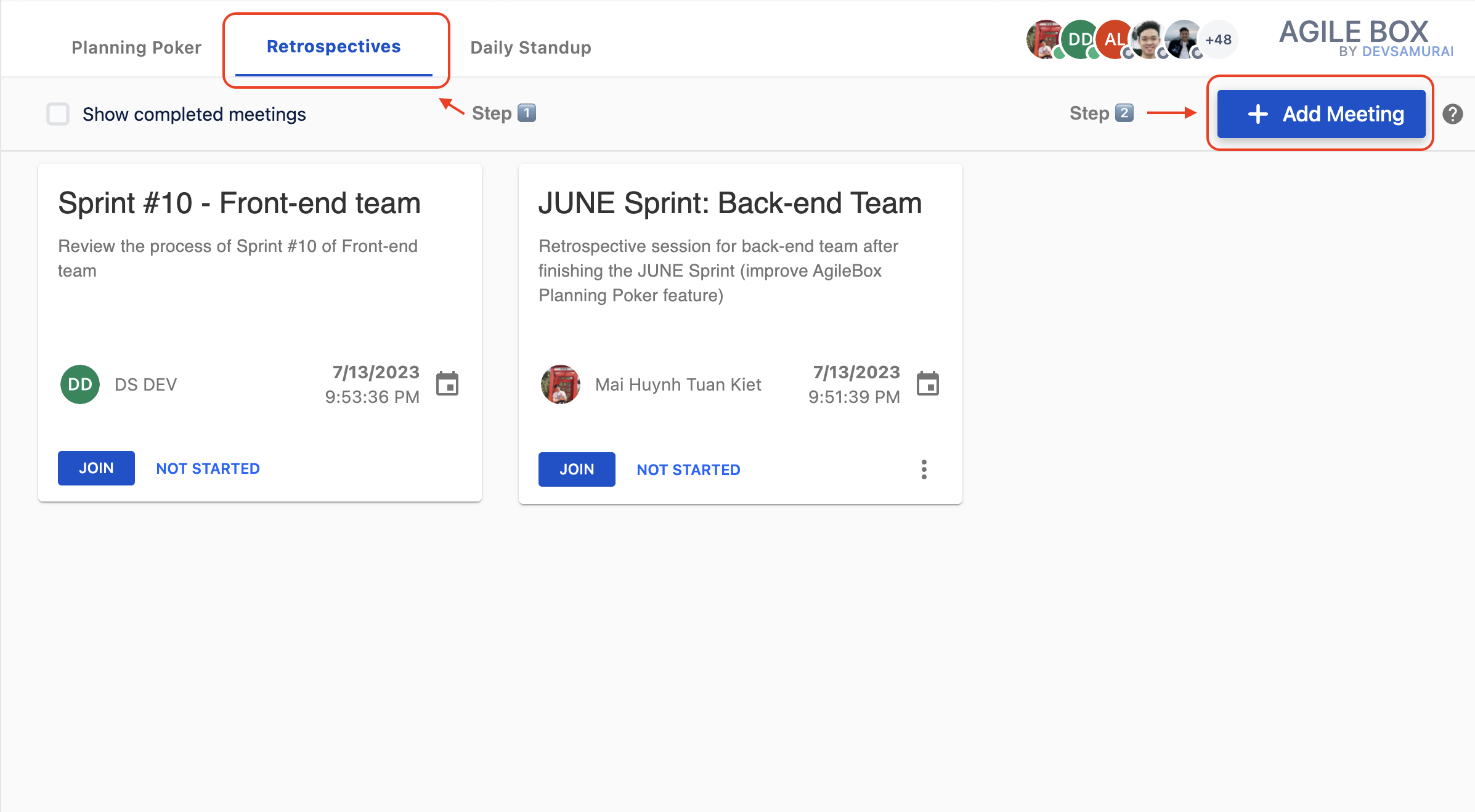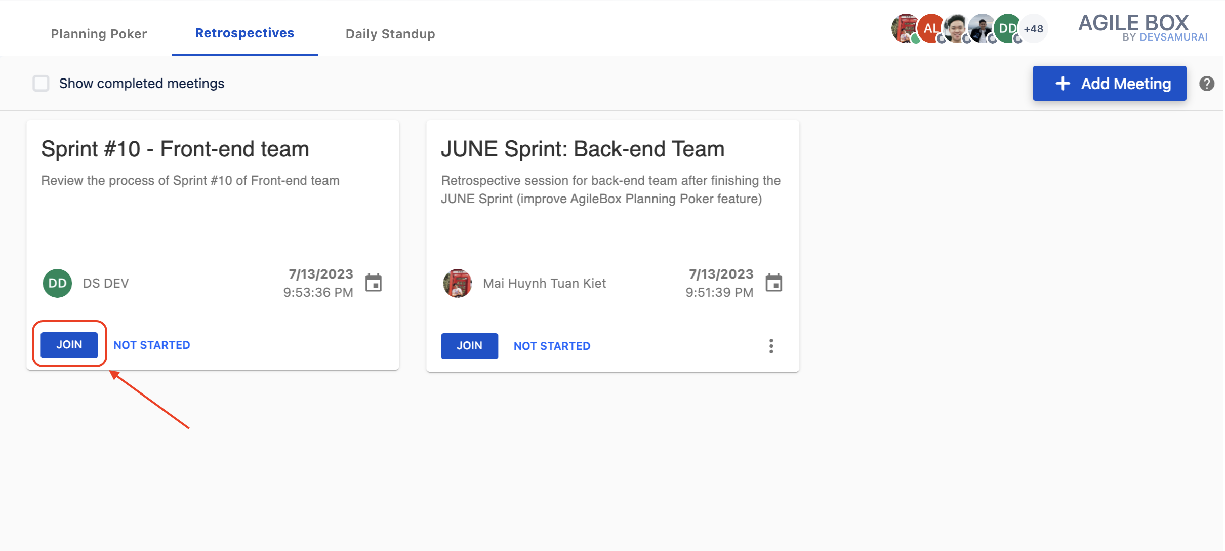 From the list of all retrospective meetings in the project, find and click JOIN the meeting you want to participate in.
