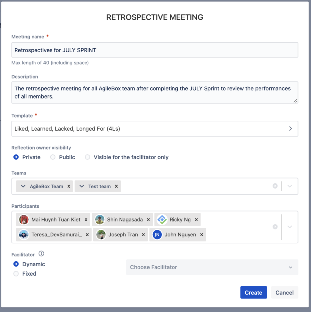 Fill out all the information of the new retrospective session to the form as below: